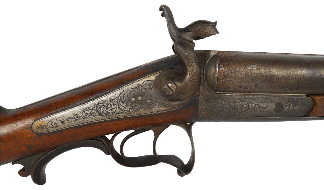 Shotgun, Side by Side, exposed hammer, pin fire, Damascus bbl, 29 1/4", engraved action, trigger guard & hammers, underlever lock, forend looks replaced.