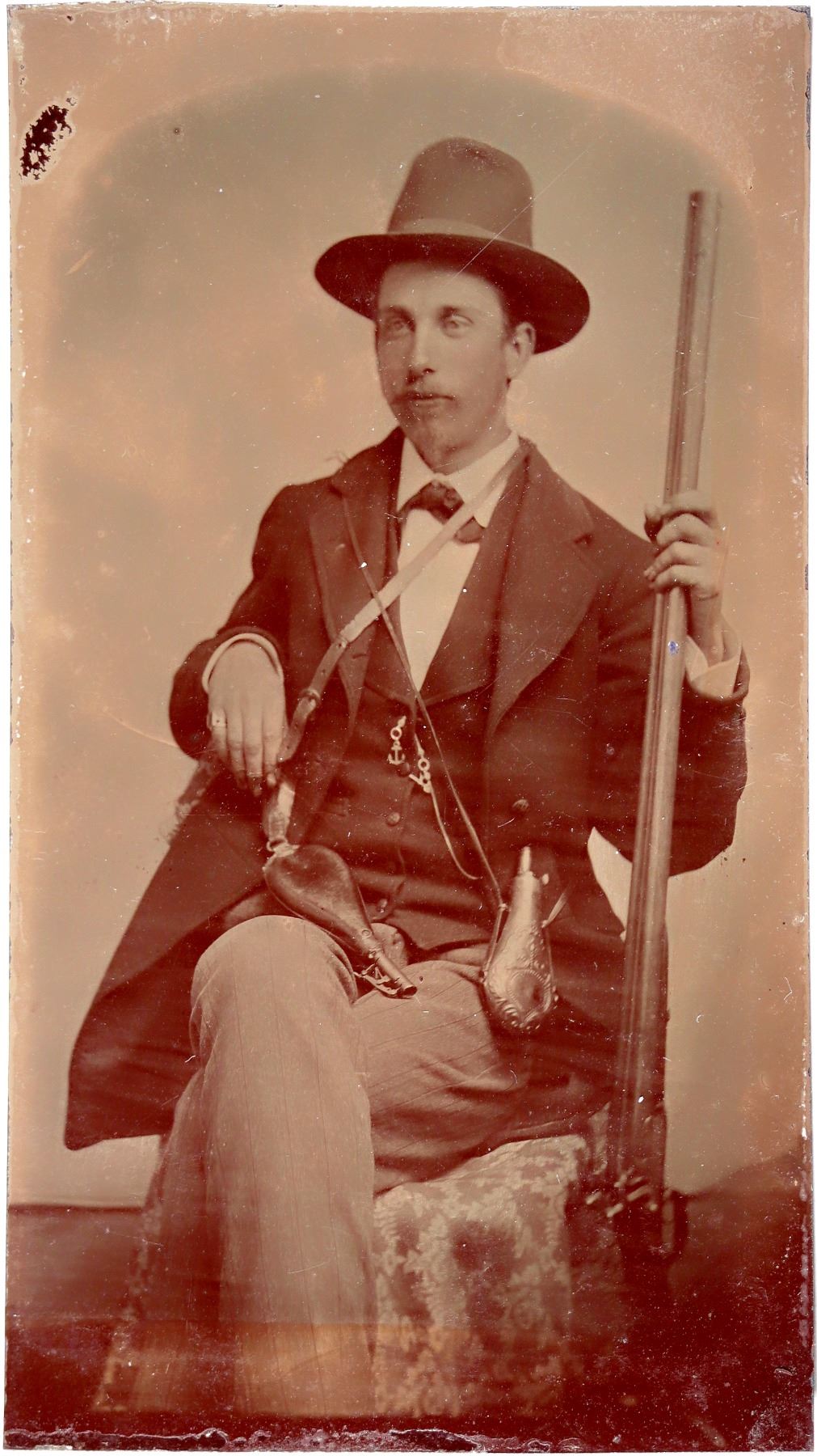 Vintage tintype of a man and his double barrel, side by side, hammer shotgun. A muzzleloader with shot pouch and powder flask hanging around his neck. Appears to be a ten guage. Circa 1860-70. 2 x 3 1/2 inches.
