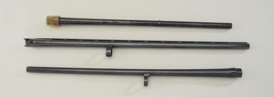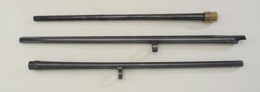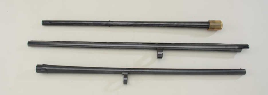 Shotgun barrel lot consisting of Remington marked barrel, Full choked for 3"magnum with vent rib, 30" - very good to near fine; Remington marked 12 gauge barrel with vent rib and Poly-Choked 28"; Winchester Model1200 12 gauge modified barrel, 28" - very good to near fine; and a 12 gauge barrel marked "Italy", 26" - not marked but near excellent. Est. $150-$300.