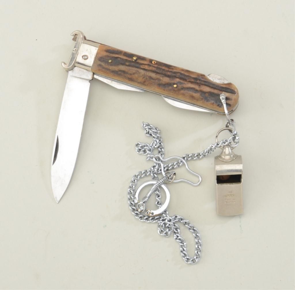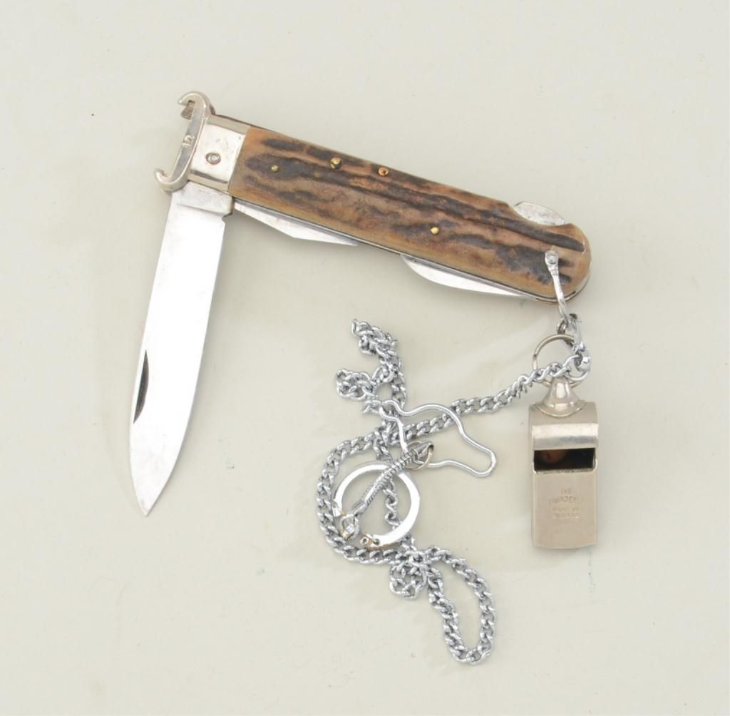 Shotgun extractor pocket knife with chain & whistle in overall good condition. Est.: $50-$100.