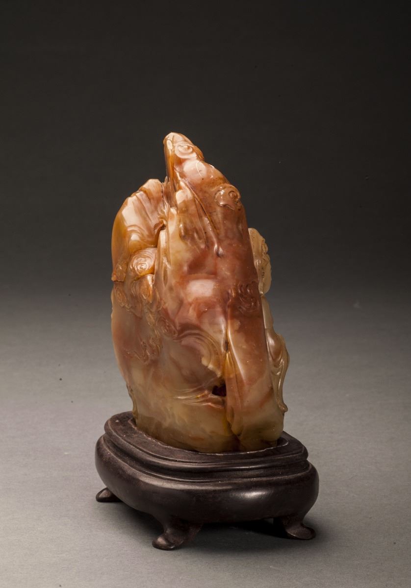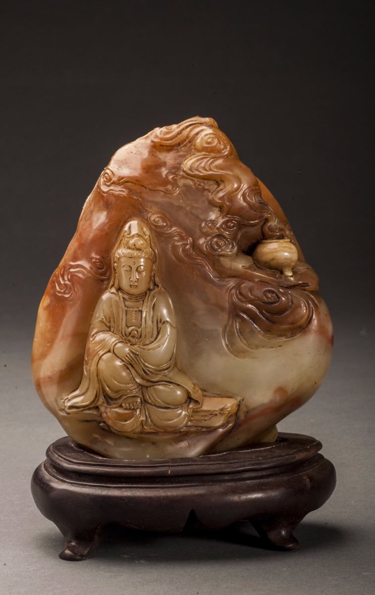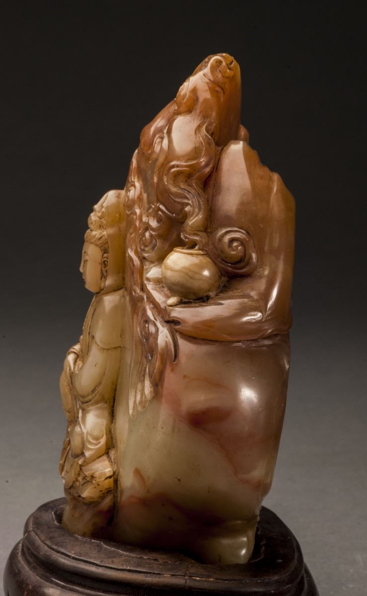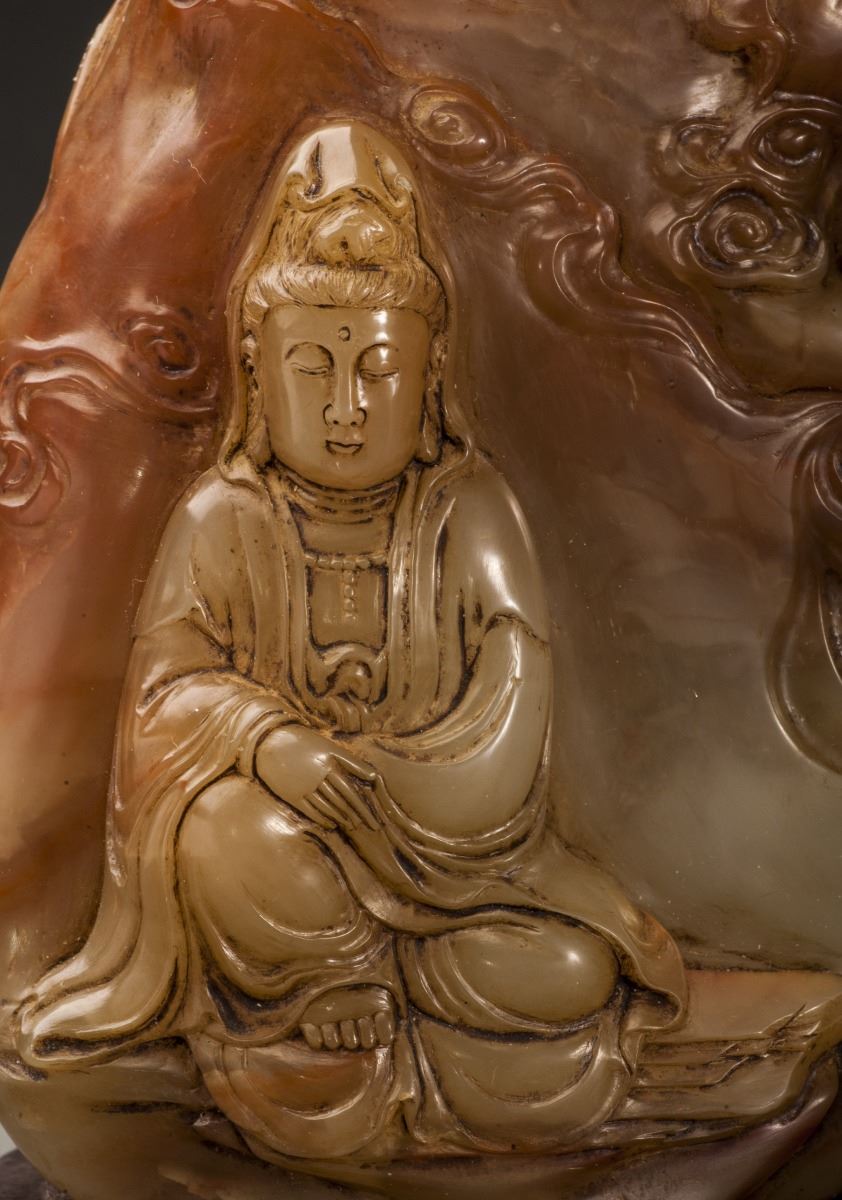 A Fine Shoushan Stone, Carved With A Vivid Designed Guan Yin Statue. The Guan Yin Dressed In Long Lobe, Face Vividly Expressed. Designed In Extremely Detailed. All Set Within The Mountain Landscape And Clouds.