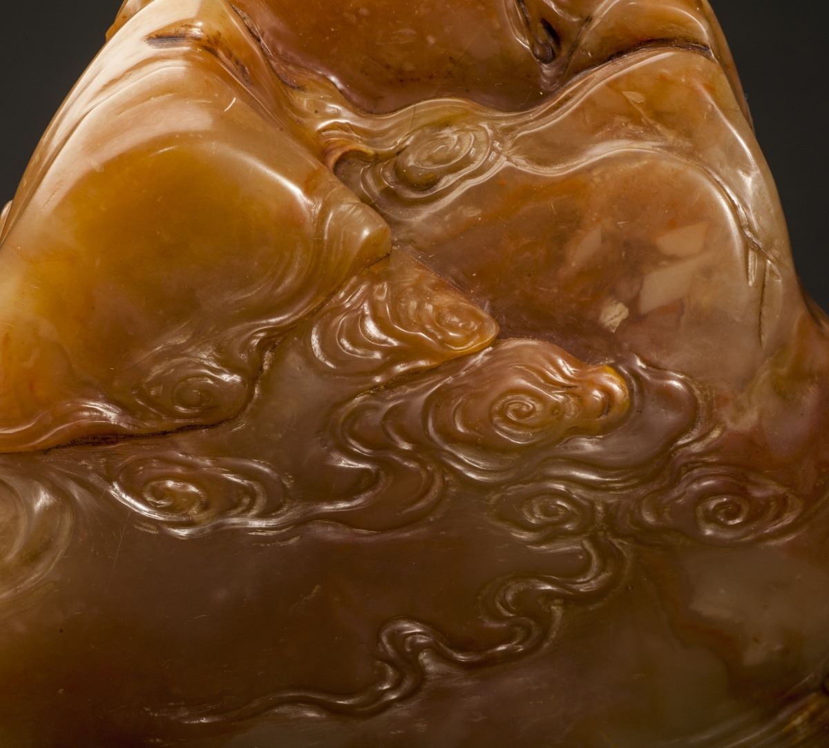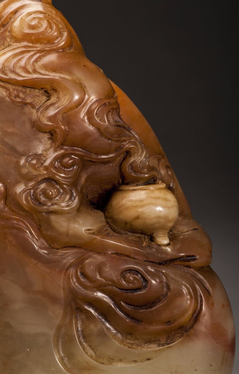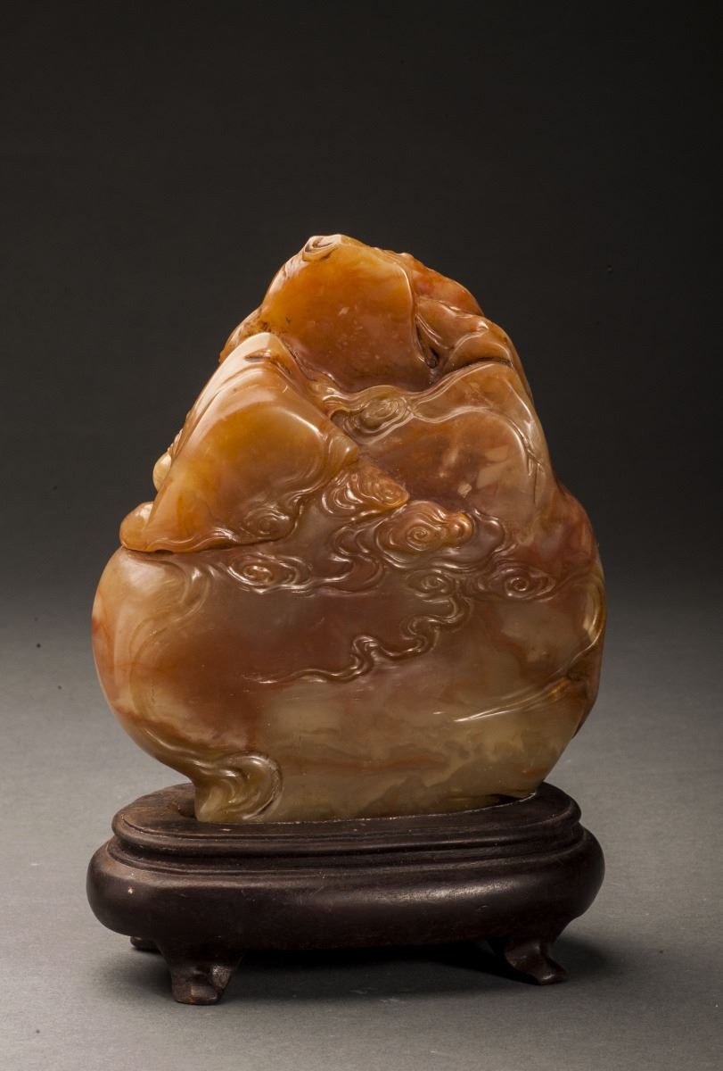 A Fine Shoushan Stone, Carved With A Vivid Designed Guan Yin Statue. The Guan Yin Dressed In Long Lobe, Face Vividly Expressed. Designed In Extremely Detailed. All Set Within The Mountain Landscape And Clouds.