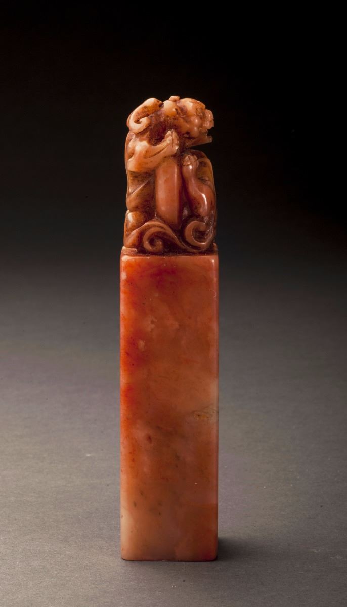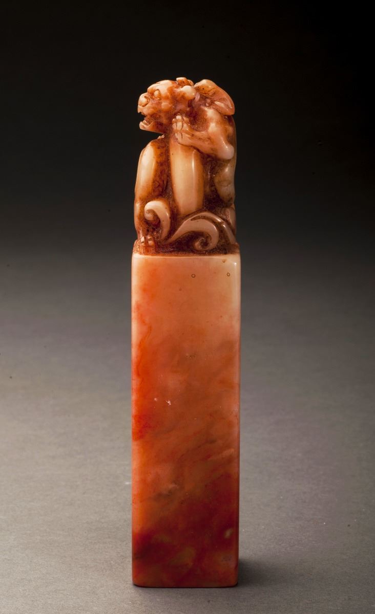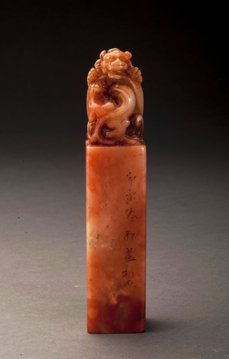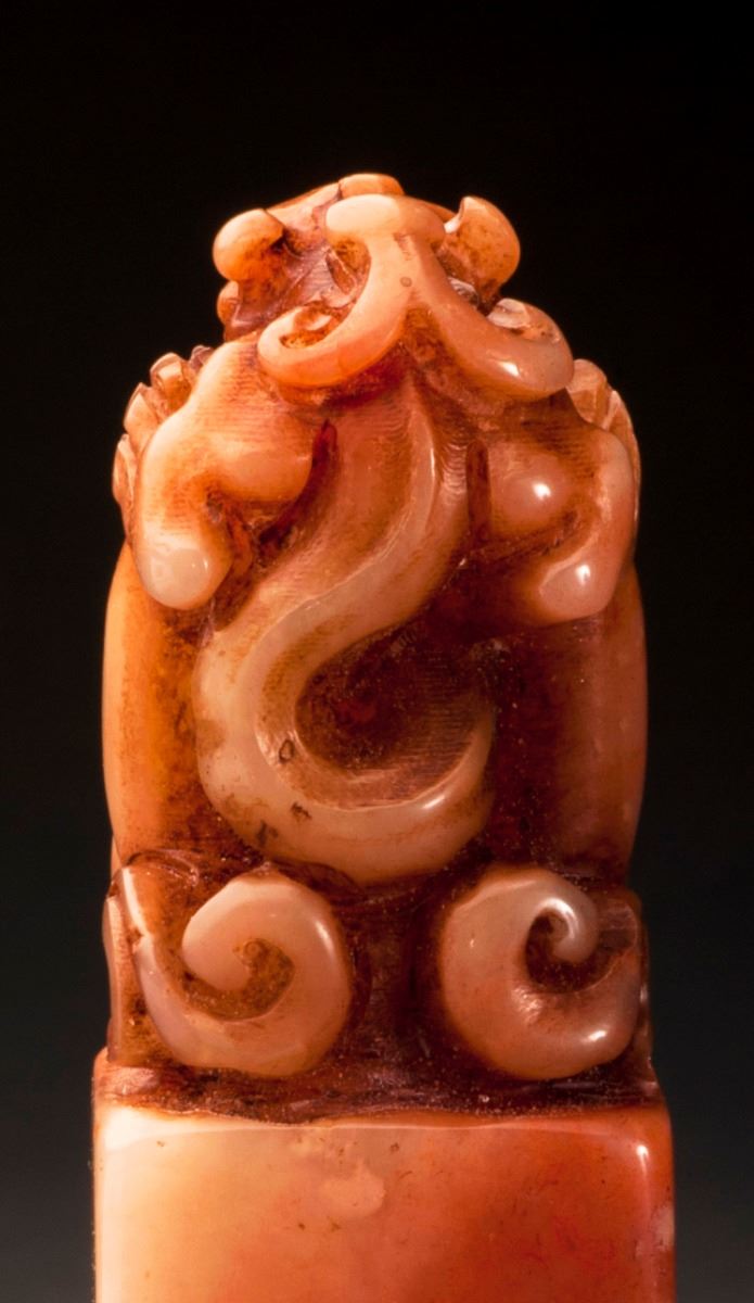 This Fine Shoushan Stone Seal In Good Condition, With A Vivid Carved Dragon Statue On Top. Within The Alterative Light Brown And Red Tone Throughout.