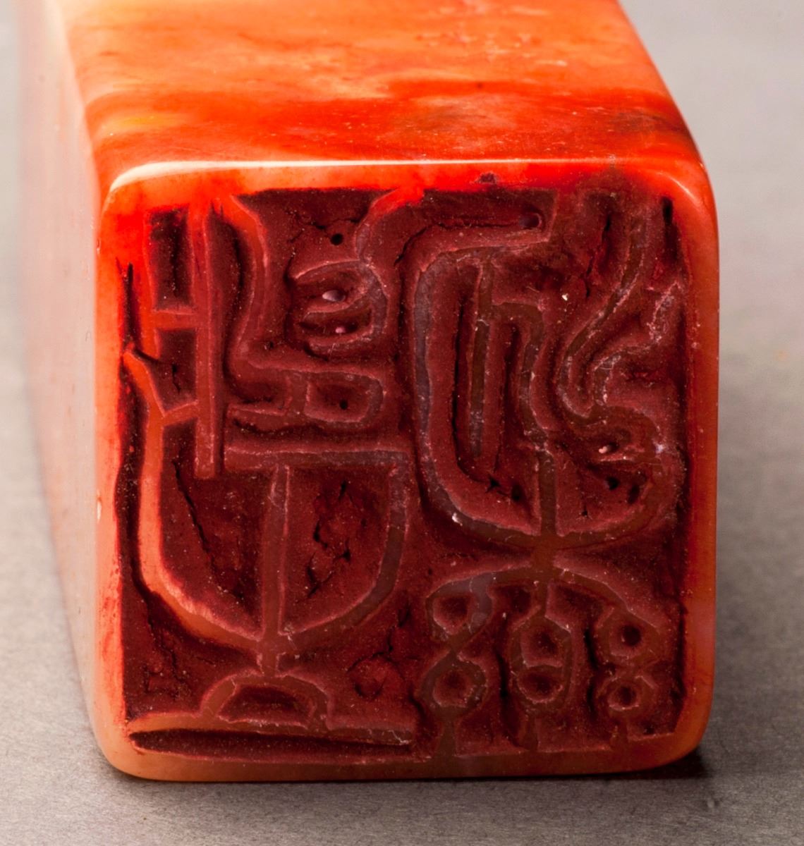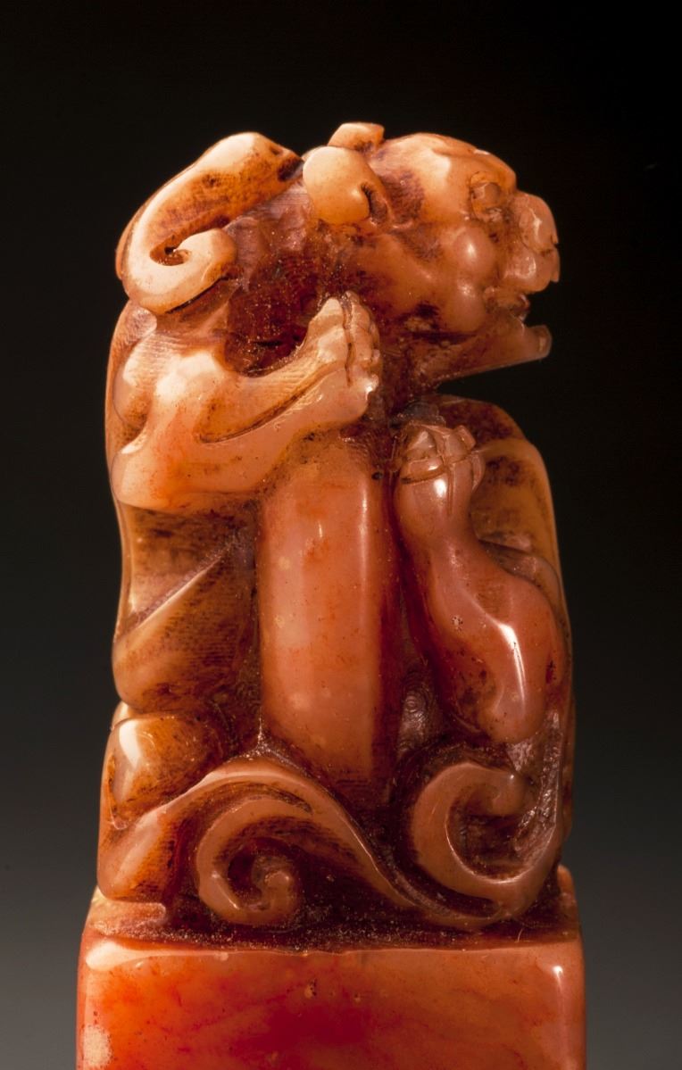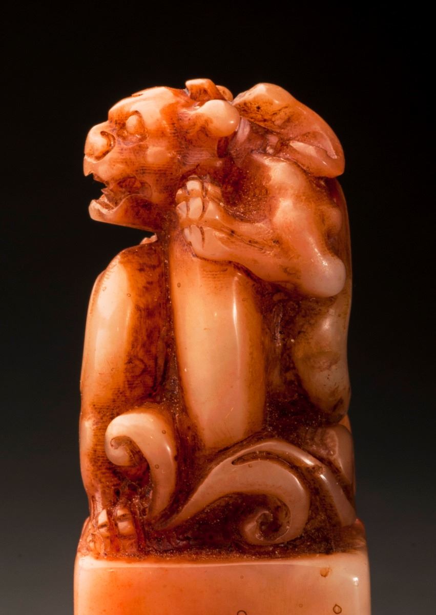 This Fine Shoushan Stone Seal In Good Condition, With A Vivid Carved Dragon Statue On Top. Within The Alterative Light Brown And Red Tone Throughout.