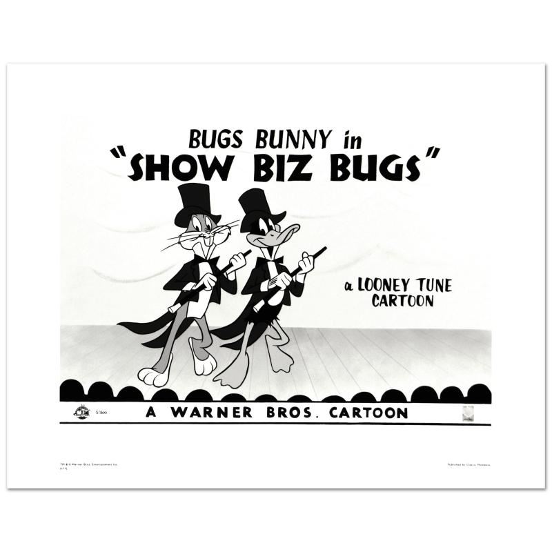 "Show Biz Bugs" is a limited edition giclee on paper from Warner Bros., numbered with hologram seal of Authenticity. This image was originally used as a "lobby card" displayed in theater lobbies to publicize animated shorts. Also, includes Certificate of Authenticity! Measures approx. 20" x 16" (with border), 16" x 12" (image).