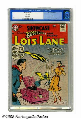 <B>Showcase #10 Lois Lane (DC, 1957) CGC FN 6.0 Off-white pages.</B></I> "Superman's Girl Friend" returned for the second issue of a two-issue tryout; you may be surprised to know that she became the first <B>Showcase</B></I> tryout character to get her own series, beating that speedster the Flash despite his six-issue head start! Lois benefited from cover and interior art by Wayne Boring, and it certainly didn't hurt that Superman put in an appearance on the cover. Also, Super-Dad Jor-El makes a cameo in the story itself. Overstreet 2005 FN 6.0 value = $678. CGC census 5/05: 4 in 6.0, 11 higher.