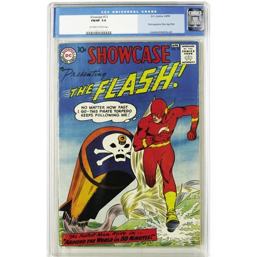 <B>Showcase #13 The Flash (DC, 1958) CGC FN/VF 7.0 Off-white to white pages.</B></I> The Silver Age Flash's third appearance had him facing his third consecutive new villain -- this time it was Mister Element making his debut. Carmine Infantino handled the cover and interior art. Overstreet 2006 FN 6.0 value = $945; VF 8.0 value = $2,882. CGC census 3/06: 6 in 7.0, 11 higher.