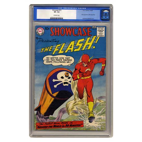 <B>Showcase #13 The Flash (DC, 1958) CGC VF- 7.5 Off-white pages.</B></I> Barry Allen, the Silver Age Flash, made his third appearance in this issue, which also has the origin and first appearance of Mister Element. Carmine Infantino handled the cover and interior art. Overstreet 2005 VF 8.0 value = $2,873. CGC census 12/05: 6 in 7.5, 5 higher.