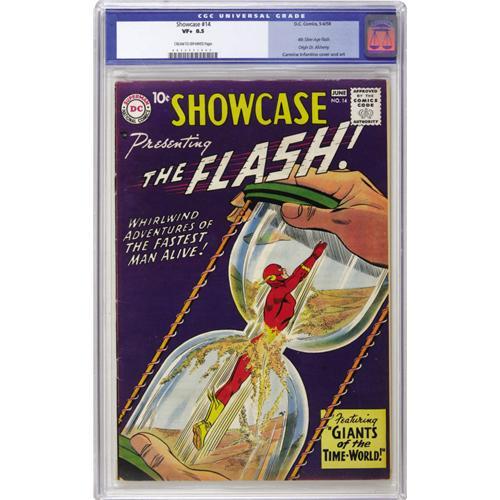 <B>Showcase #14 The Flash (DC, 1958) CGC VF+ 8.5 Cream to off-white pages.</B></I> "Rare in NM," says Overstreet about this issue, and indeed, the two copies graded higher on CGC's census are just a half-grade above this one at VF/NM. This is just the fourth appearance of the Silver Age Flash. He tangles with his foe from the previous issue, Mr. Element, but this time the villain is calling himself Dr. Alchemy! Carmine Infantino handled the art. Overstreet 2006 VF 8.0 value = $3,020; VF/NM 9.0 value = $5,310. CGC census 10/06: 2 in 8.5, 2 higher.<BR><BR><b>Shipping:</b> Slabbed Comic (<a target="_blank" href="http://www.heritageauctions.com/common/shipping.php">view shipping information</a>)