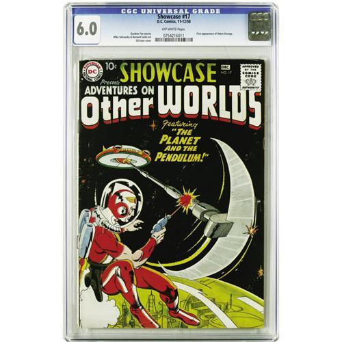 <B>Showcase #17 Adventures On Other Worlds (DC, 1958) CGC FN 6.0 Off-white pages.</B></I> Gardner Fox's planet-hopping hero Adam Strange made his first appearance in this try-out issue. Mike Sekowsky and Bernard Sachs got the nod to illustrate this first tale; Carmine Infantino would soon make the character his own when the series moved over to <B>Mystery In Space</B></I>. The cool cover is by Gil Kane. Overstreet 2006 FN 6.0 value = $570. CGC census 3/06: 3 in 6.0, 6 higher.