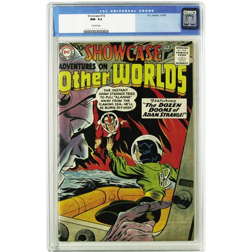 <B>Showcase #18 Adventures On Other Worlds (DC, 1959) CGC NM- 9.2 Cream pages.</B></I> This is just the second appearance of Adam Strange, and this copy's got the highest grade yet assigned! The issue has a Gil Kane cover and Mike Sekowsky art. Overstreet 2006 NM- 9.2 value = $2,000. CGC census 3/06: 2 in 9.2, none higher.