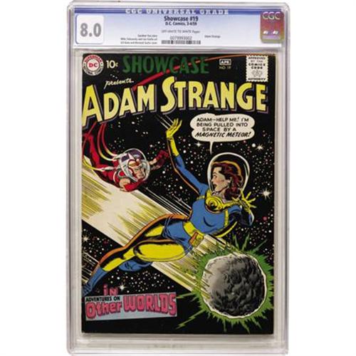 <B>Showcase #19 Adam Strange (DC, 1959) CGC VF 8.0 Off-white to white pages.</B></I> This was the third Adam Strange tryout in <B>Showcase</B></I>, but the first time the <I>Adam Strange </B></I>logo was used on the cover. In the two previous issues, the logo had been <I>Adventures on Other Worlds</B></I>. Gil Kane did the cover, with Mike Sekowsky handling the Adam Strange story. Overstreet 2007 VF 8.0 value = $935. CGC census 6/07: 3 in 8.0, 3 higher. <I>From the Keith Marlow Collection.</B></I><BR><BR><b>Shipping:</b> Comics - Slabbed (certified) (<a target="_blank" href="http://www.heritageauctions.com/common/shipping.php">view shipping information</a>)
