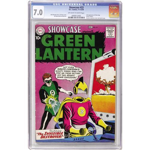 <B>Showcase #23 Green Lantern (DC, 1959) CGC FN/VF 7.0 Off-white to white pages.</B></I> Reviving and updating Green Lantern proved more of an instant success than reinventing the Flash in 1956. It's easy to see why. Artist Gil Kane was at the top of his game with this nuclear explosion cover (and splash page), and with his interior story art, and John Broome's scripts were entertaining. This was the second tryout appearance of the Silver Age Green Lantern. Overstreet 2006 FN 6.0 value = $390; VF 8.0 value = $1,105. CGC census 3/07: 6 in 7.0, 6 higher. <I> From the Janowicz Collection.</B></I><BR><BR><b>Shipping:</b> Comics - Slabbed (certified) (<a target="_blank" href="http://www.heritageauctions.com/common/shipping.php">view shipping information</a>)