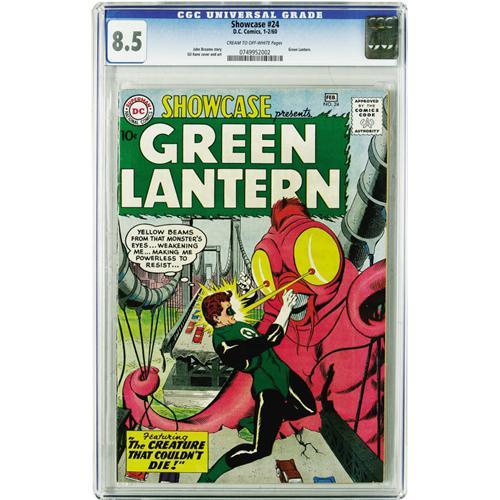 <B>Showcase #24 Green Lantern (DC, 1960) CGC VF+ 8.5 Cream to off-white pages.</B></I> This is the third appearance of the Silver Age Green Lantern, and our offering is just half a grade below the best copy in CGC's census as of this writing. A word on the page quality: this copy's cream to off-white pages are the <I>best</B></I> of any copy we've handled, with many certified with cream pages -- we suspect that the whole run of this issue was printed on inferior paper stock. Gil Kane handled the issue's cover and interior art. Overstreet 2006 VF 8.0 value = $1,105; VF/NM 9.0 value = $1,853. CGC census 3/06: 3 in 8.5, 3 higher.