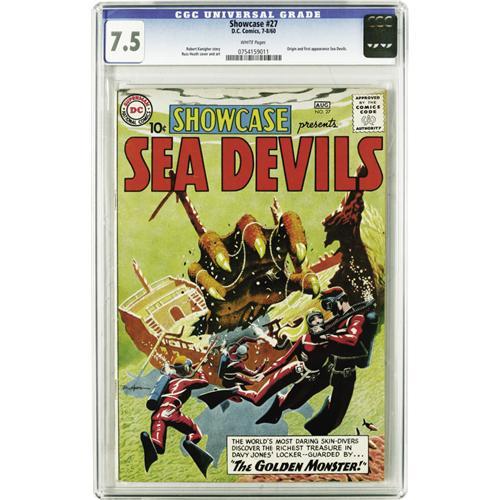 <B>Showcase #27 Sea Devils (DC, 1960) CGC VF- 7.5 White pages.</B></I> This issue's got the origin and first appearance of the Sea Devils, by the outstanding creative team of writer Robert Kanigher and artist Russ Heath. Overstreet 2006 VF 8.0 value = $604. CGC census 3/06: 7 in 7.5, 11 higher.
