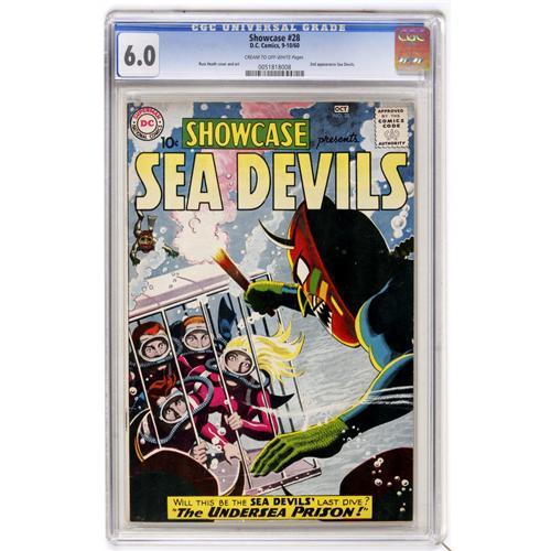 <B>Showcase #28 The Sea Devils (DC, 1960) CGC FN 6.0 Cream to off-white pages.</B></I> Second appearance of the Sea Devils. Russ Heath cover and art. Overstreet 2006 FN 6.0 value = $120. CGC census 3/07: 3 in 6.0, 14 higher.<BR><BR><b>Shipping:</b> Comics - Slabbed (certified) (<a target="_blank" href="http://www.heritageauctions.com/common/shipping.php">view shipping information</a>)