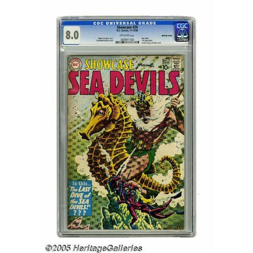 <B>Showcase #29 Sea Devils - Mohawk Valley pedigree (DC, 1960) CGC VF 8.0 Off-white pages.</B></I> Russ Heath executed this striking grey tone cover as well as the book's interior art. This lot comes with the Mohawk Valley certificate of authenticity. Overstreet 2005 VF 8.0 value = $300. CGC census 9/05: 4 in 8.0, 3 higher. <BR><BR><B>Important notice:</B> Heritage usually auctions material at the rate of 200-250 lots per hour. On some occasions eBay Live bid software or the Internet may not be able to keep up with the pace of the auction. We recommend placing a realistic absentee bid now as insurance to avoid disappointment. Occasionally the auctioneer may eliminate or reject an eBay Live bid, and the auctioneer may also reopen a lot after the close of the eBay live bidding (usually because we missed an audience bid), and may reject your bid even if it shows you as the winning bidder. By bidding via eBay Live, you agree that Heritage may award the lot to another bidder at its sole discretion under the circumstances described above or any other reasonable circumstances. Since eBay bids are not shown to us until we open the lot on the floor, we treat those bids just like floor bids. In most cases the floor responds before the eBay bid is presented to us, due to Internet lag time, so for consistency we have made it a policy that floor bids are always considered first over tie eBay live bids. Also please note that all Heritage lots purchased through eBay Live carry a 20% Buyer's Premium. Please make sure you read the Terms and Conditions before you bid. This lot is being auctioned in conjunction with a live floor auction by Heritage Galleries & Auctioneers. All final auction and invoice information will be supplied by Heritage Galleries & Auctioneers, and all other information should be considered preliminary. Lot:1309 <BR><BR><B>Winning Notification and Billing:</B> After the FINAL session in this auction is complete, Heritage will send e-mail and snail mail invoices.