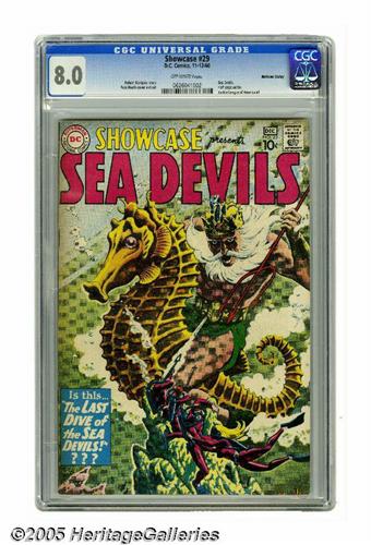 <B>Showcase #29 Sea Devils - Mohawk Valley pedigree (DC, 1960) CGC VF 8.0 Off-white pages.</B></I> Russ Heath executed this striking grey tone cover as well as the book's interior art. This lot comes with the Mohawk Valley certificate of authenticity. Overstreet 2005 VF 8.0 value = $300. CGC census 6/05: 3 in 8.0, 3 higher.