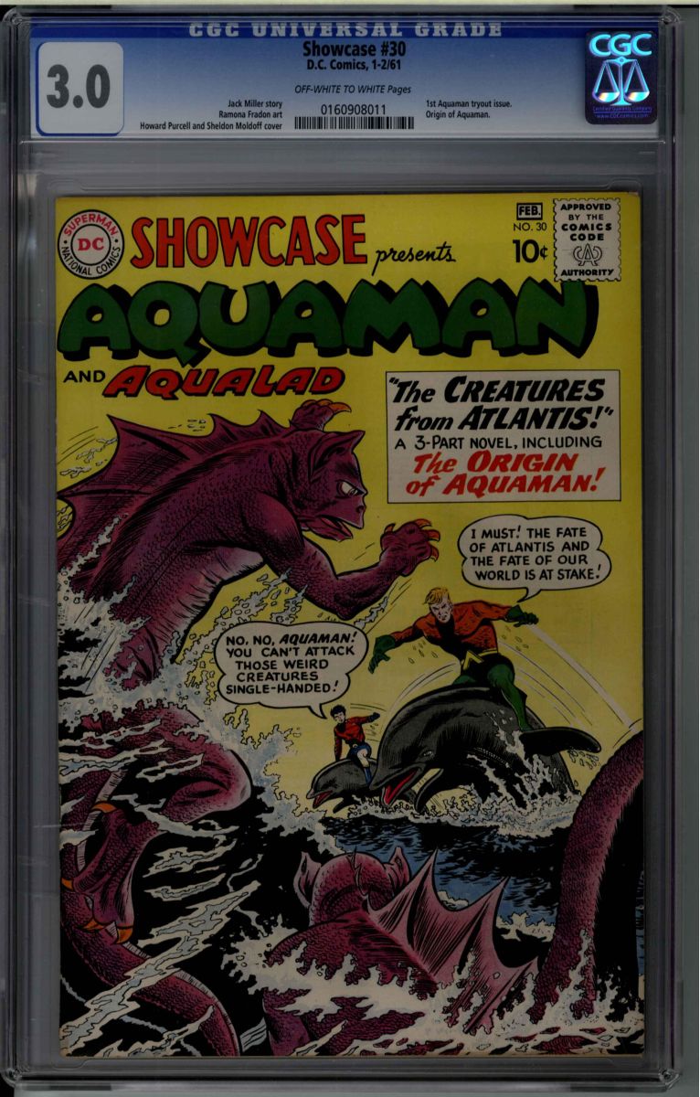 Showcase #30 CGC 3.0 off-white to white pages. Jack Miller story, Ramona Fradon art. Howard Purcell and Sheldon Moldoff cover. 1st Aquaman tryout issue, origin of Aquaman. Overstreet 2009 GD 2.0 value = $75; VG 4.0 value = $150. CGC census: 8 at 3.0, 101 higher.