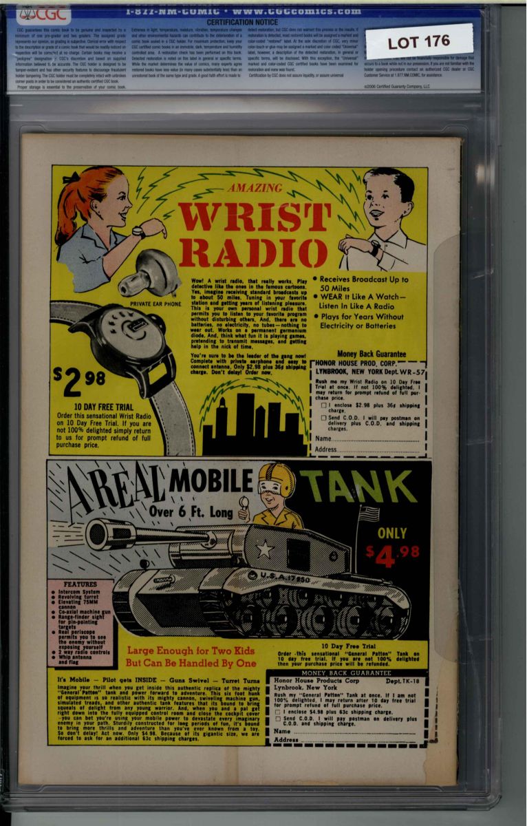 The Auctioneer has reserved the right to reject any and all bids, and to bid at the auction. Auctioneers Auctions are not on approval. Auctioneer does not allow certified material to be returned because of possible differences of opinion with respect to the grade offered by any third party organization, dealer, or service. Absolutely no guarantee of grade is offered for un-certified property sold and subsequently submitted to a third-party grading service. There will be no exceptions to this policy. Under extremely limited circumstances, (e.g. gross cataloging error) a purchaser, who did not bid from the floor, may request Auctioneer to evaluate voiding a sale; such request must be made in writing detailing the alleged gross error, and submission of the lot to the Auctioneer must be pre-approved by the Auctioneer. Bidder must notify Auctioneer in writing of such request within three (3) days of the non-floor bidder receipt of the lot. Any lot that is to be evaluated must be in our offices within 30 days after Auction. Grading does not qualify for this evaluation process nor do such complaints constitute a basis to challenge the authenticity of a lot. AFTER THAT 30-DAY PERIOD, NO LOTS MAY BE RETURNED FOR REASONS OTHER THAN AUTHENTICITY. Lots returned must be housed intact in the original holder. No lots purchased by floor Bidders may be returned (including those Bidders acting as agents for others). Late remittance for purchases may be considered just cause to revoke all return privileges. B: Auctions conducted solely on the Internet have a THREE (3) DAY RETURN POLICY: Lots paid for within seven days of the Auction closing are sold with a three (3) day return privilege. You may return lots under the following conditions: Within three days of receipt of the lot, you must first notify Auctioneer by contacting Client Service by phone (314-680-8599) or e-mail (moundcityauctions@gmail.com), and immediately mail the lot(s) fully insured to the attention of Returns, Mound City Auctions 1081 Teson Rd. Hazelwood, MO. 63042. Lots must be housed intact in their original holder and in their original condition. You are responsible for the insured, safe delivery of any lots. Auctioneer will not be responsible for lots returned in non-registered mail or lots returned without prior authorization per section B. A non-negotiable return fee of 5% of the purchase price ($10 per lot minimum) will be deducted from the refund for each returned lot or billed directly. Postage and handling fees are not refunded. After the three-day period (from receipt), no items may be returned for any reason. Late remittance for purchases revokes all Return-Restock privileges. C: Bidders who have inspected the lots prior to the auction will not be granted any return privileges. D: Comic books sold referencing a third-party grading service are sold “as is” without any express or implied warranty. Certain warranties may be available from the grading services and the Bidder is referred to them for further details: Certified Guaranty Company, LLC. (CGC), P.O. Box 4738, Sarasota, FL 34230. E: Bidders who intend to challenge authenticity or provenance of a lot must notify Auctioneer in writing within thirty (30) days of the Auctions conclusion. In the event Auctioneer cannot deliver the lot or subsequently it is established that the lot lacks title, provenance, authenticity, or other transfer or condition issue is claimed, Auctioneer's liability shall be limited to rescission of sale and refund of purchase price; in no case shall Auctioneer's maximum liability exceed the high bid on that lot, which bid shall be deemed for all purposes the value of the lot. After one year has elapsed, Auctioneer's maximum liability shall be limited to any commissions and fees Auctioneer earned on that lot. F: All comics are guaranteed genuine, but are not guaranteed as to grade, since grading is a matter of opinion, an art and not a science, and therefore the opinion rendered by the Auctioneer or any third party grading service may not agree with the opinion of others (including trained experts), and the same expert may not grade the same item with the same grade at two different times. G: Since we cannot examine encapsulated comics, they are sold “as is”without our grading opinion, and may not be returned for any reason. Auctioneer shall not be liable for any patent or latent defect or controversy pertaining to or arising from any encapsulated collectible. In any such instance, purchaser's remedy, if any, shall be solely against the service certifying the collectible. H: Due to changing grading standards over time, differing interpretations, and to possible mishandling of items by subsequent owners, Auctioneer reserves the right to grade items differently than shown on certificates from any grading service that accompany the items. Auctioneer also reserves the right to grade items differently than the grades shown in the prior catalog should such items be reconsigned to any future auction. I: Although consensus grading is employed by most grading services, it should be noted as aforesaid that grading is not an exact science. In fact, it is entirely possible that if a lot is broken out of a plastic holder and resubmitted to another grading service or even to the same service, the lot could come back with a different grade assigned. J: Certification does not guarantee protection against the normal risks associated with potentially volatile markets. The degree of liquidity for certified collectibles will vary according to general market conditions and the particular lot involved. For some lots there may be no active market at all at certain points in time."