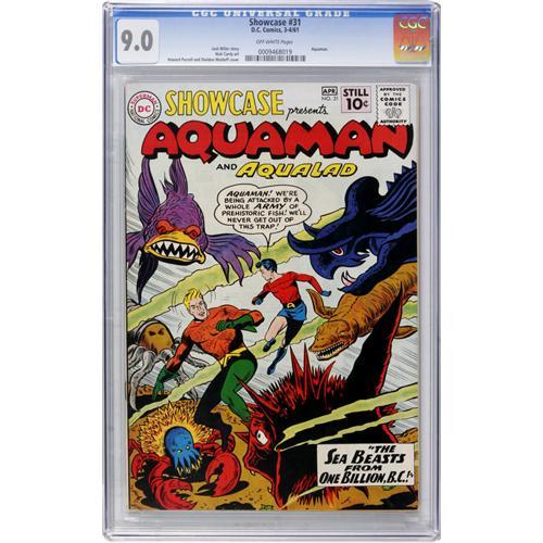 <B>Showcase #31 Aquaman (DC, 1961) CGC VF/NM 9.0 Off-white pages.</B></I> Just the second solo comic for Aquaman, this one has a Howard Purcell cover and interior art by Nick Cardy. Overstreet 2006 VF/NM 9.0 value = $490; NM- 9.2 value = $680. CGC census 3/07: 1 in 9.0, 1 higher. <I> From the Warren Hall Collection.</B></I><BR><BR><b>Shipping:</b> Comics - Slabbed (certified) (<a target="_blank" href="http://www.heritageauctions.com/common/shipping.php">view shipping information</a>)