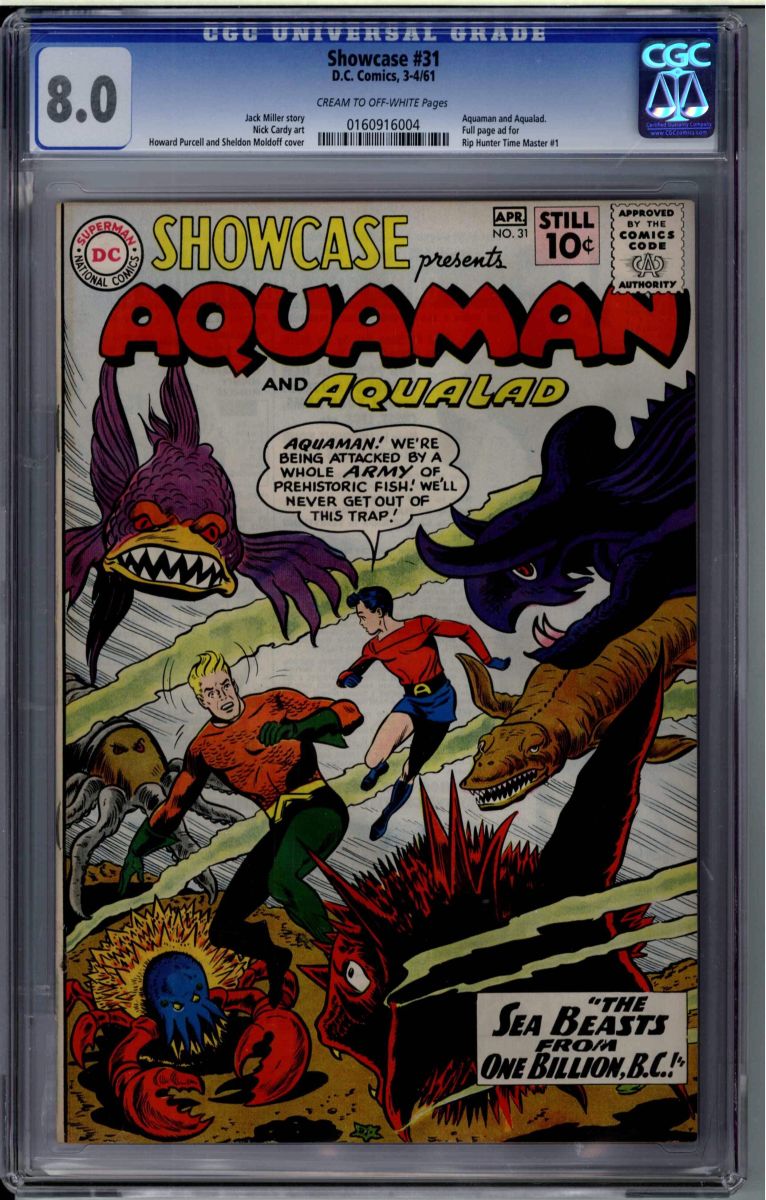 Showcase #31 CGC 8.0 cream to off-white pages. Jack Miller story. Nick Cardy art, Howard Purcell and Sheldon Moldoff cover. Full page ad for Rip Hunter Time Master #1. Overstreet 2009 VF 8.0 value = $312. The CGC universal census reports 8 at 8.0 and 8 higher.