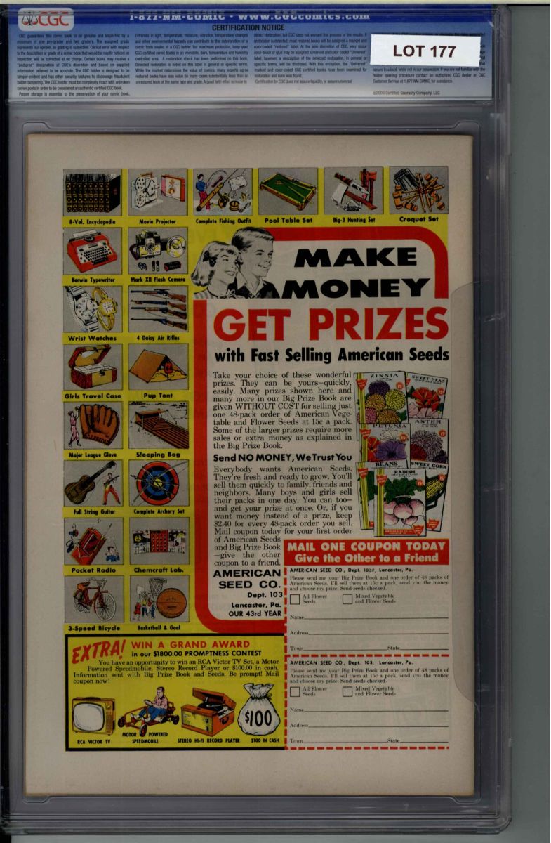 The Auctioneer has reserved the right to reject any and all bids, and to bid at the auction. Auctioneers Auctions are not on approval. Auctioneer does not allow certified material to be returned because of possible differences of opinion with respect to the grade offered by any third party organization, dealer, or service. Absolutely no guarantee of grade is offered for un-certified property sold and subsequently submitted to a third-party grading service. There will be no exceptions to this policy. Under extremely limited circumstances, (e.g. gross cataloging error) a purchaser, who did not bid from the floor, may request Auctioneer to evaluate voiding a sale; such request must be made in writing detailing the alleged gross error, and submission of the lot to the Auctioneer must be pre-approved by the Auctioneer. Bidder must notify Auctioneer in writing of such request within three (3) days of the non-floor bidder receipt of the lot. Any lot that is to be evaluated must be in our offices within 30 days after Auction. Grading does not qualify for this evaluation process nor do such complaints constitute a basis to challenge the authenticity of a lot. AFTER THAT 30-DAY PERIOD, NO LOTS MAY BE RETURNED FOR REASONS OTHER THAN AUTHENTICITY. Lots returned must be housed intact in the original holder. No lots purchased by floor Bidders may be returned (including those Bidders acting as agents for others). Late remittance for purchases may be considered just cause to revoke all return privileges. B: Auctions conducted solely on the Internet have a THREE (3) DAY RETURN POLICY: Lots paid for within seven days of the Auction closing are sold with a three (3) day return privilege. You may return lots under the following conditions: Within three days of receipt of the lot, you must first notify Auctioneer by contacting Client Service by phone (314-680-8599) or e-mail (moundcityauctions@gmail.com), and immediately mail the lot(s) fully insured to the attention of Returns, Mound City Auctions 1081 Teson Rd. Hazelwood, MO. 63042. Lots must be housed intact in their original holder and in their original condition. You are responsible for the insured, safe delivery of any lots. Auctioneer will not be responsible for lots returned in non-registered mail or lots returned without prior authorization per section B. A non-negotiable return fee of 5% of the purchase price ($10 per lot minimum) will be deducted from the refund for each returned lot or billed directly. Postage and handling fees are not refunded. After the three-day period (from receipt), no items may be returned for any reason. Late remittance for purchases revokes all Return-Restock privileges. C: Bidders who have inspected the lots prior to the auction will not be granted any return privileges. D: Comic books sold referencing a third-party grading service are sold “as is” without any express or implied warranty. Certain warranties may be available from the grading services and the Bidder is referred to them for further details: Certified Guaranty Company, LLC. (CGC), P.O. Box 4738, Sarasota, FL 34230. E: Bidders who intend to challenge authenticity or provenance of a lot must notify Auctioneer in writing within thirty (30) days of the Auctions conclusion. In the event Auctioneer cannot deliver the lot or subsequently it is established that the lot lacks title, provenance, authenticity, or other transfer or condition issue is claimed, Auctioneer's liability shall be limited to rescission of sale and refund of purchase price; in no case shall Auctioneer's maximum liability exceed the high bid on that lot, which bid shall be deemed for all purposes the value of the lot. After one year has elapsed, Auctioneer's maximum liability shall be limited to any commissions and fees Auctioneer earned on that lot. F: All comics are guaranteed genuine, but are not guaranteed as to grade, since grading is a matter of opinion, an art and not a science, and therefore the opinion rendered by the Auctioneer or any third party grading service may not agree with the opinion of others (including trained experts), and the same expert may not grade the same item with the same grade at two different times. G: Since we cannot examine encapsulated comics, they are sold “as is”without our grading opinion, and may not be returned for any reason. Auctioneer shall not be liable for any patent or latent defect or controversy pertaining to or arising from any encapsulated collectible. In any such instance, purchaser's remedy, if any, shall be solely against the service certifying the collectible. H: Due to changing grading standards over time, differing interpretations, and to possible mishandling of items by subsequent owners, Auctioneer reserves the right to grade items differently than shown on certificates from any grading service that accompany the items. Auctioneer also reserves the right to grade items differently than the grades shown in the prior catalog should such items be reconsigned to any future auction. I: Although consensus grading is employed by most grading services, it should be noted as aforesaid that grading is not an exact science. In fact, it is entirely possible that if a lot is broken out of a plastic holder and resubmitted to another grading service or even to the same service, the lot could come back with a different grade assigned. J: Certification does not guarantee protection against the normal risks associated with potentially volatile markets. The degree of liquidity for certified collectibles will vary according to general market conditions and the particular lot involved. For some lots there may be no active market at all at certain points in time."