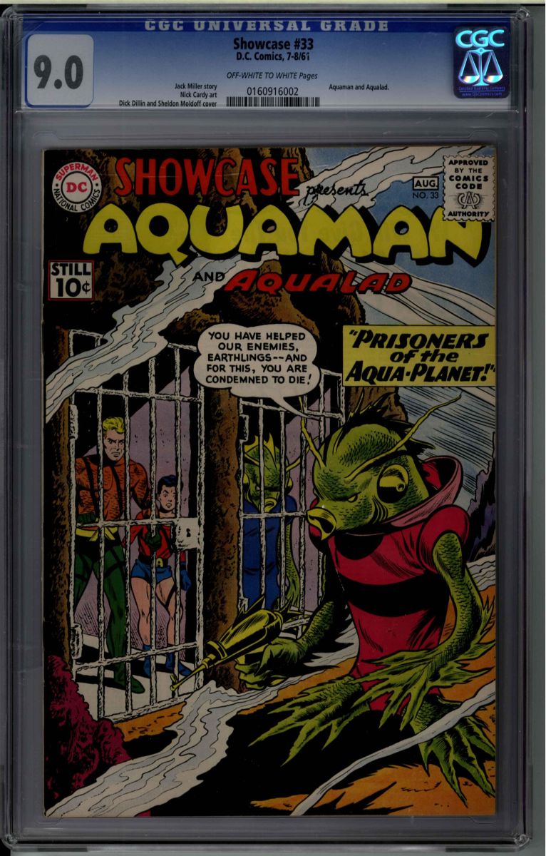 Showcase #33 CGC 9.0 off-white to white pages. Jack Miller story, Nick Cardy art. Dick Dillin and Sheldon Moldoff cover. Overstreet 2009 VF/NM 9.0 value = $581. The CGC universal census reports 1 at 9.0 and none higher.