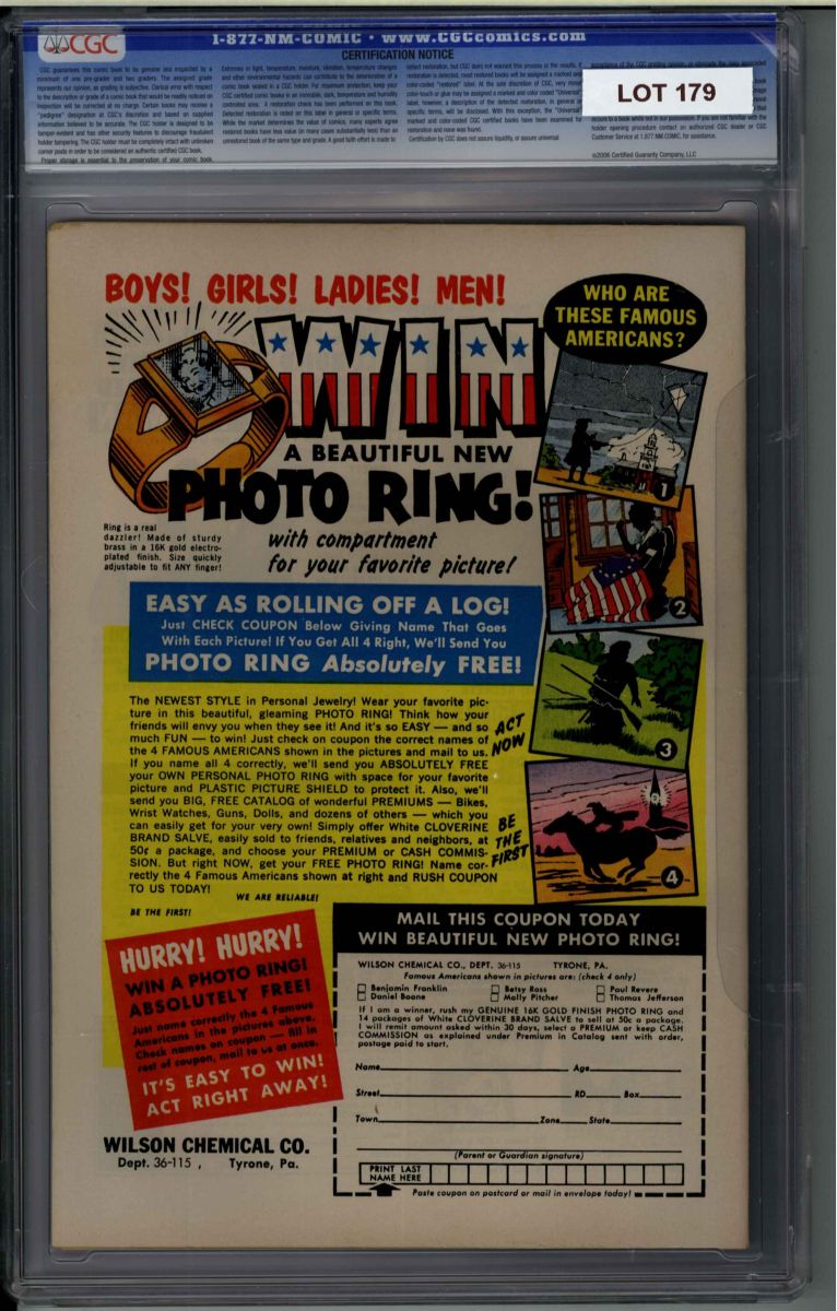The Auctioneer has reserved the right to reject any and all bids, and to bid at the auction. Auctioneers Auctions are not on approval. Auctioneer does not allow certified material to be returned because of possible differences of opinion with respect to the grade offered by any third party organization, dealer, or service. Absolutely no guarantee of grade is offered for un-certified property sold and subsequently submitted to a third-party grading service. There will be no exceptions to this policy. Under extremely limited circumstances, (e.g. gross cataloging error) a purchaser, who did not bid from the floor, may request Auctioneer to evaluate voiding a sale; such request must be made in writing detailing the alleged gross error, and submission of the lot to the Auctioneer must be pre-approved by the Auctioneer. Bidder must notify Auctioneer in writing of such request within three (3) days of the non-floor bidder receipt of the lot. Any lot that is to be evaluated must be in our offices within 30 days after Auction. Grading does not qualify for this evaluation process nor do such complaints constitute a basis to challenge the authenticity of a lot. AFTER THAT 30-DAY PERIOD, NO LOTS MAY BE RETURNED FOR REASONS OTHER THAN AUTHENTICITY. Lots returned must be housed intact in the original holder. No lots purchased by floor Bidders may be returned (including those Bidders acting as agents for others). Late remittance for purchases may be considered just cause to revoke all return privileges. B: Auctions conducted solely on the Internet have a THREE (3) DAY RETURN POLICY: Lots paid for within seven days of the Auction closing are sold with a three (3) day return privilege. You may return lots under the following conditions: Within three days of receipt of the lot, you must first notify Auctioneer by contacting Client Service by phone (314-680-8599) or e-mail (moundcityauctions@gmail.com), and immediately mail the lot(s) fully insured to the attention of Returns, Mound City Auctions 1081 Teson Rd. Hazelwood, MO. 63042. Lots must be housed intact in their original holder and in their original condition. You are responsible for the insured, safe delivery of any lots. Auctioneer will not be responsible for lots returned in non-registered mail or lots returned without prior authorization per section B. A non-negotiable return fee of 5% of the purchase price ($10 per lot minimum) will be deducted from the refund for each returned lot or billed directly. Postage and handling fees are not refunded. After the three-day period (from receipt), no items may be returned for any reason. Late remittance for purchases revokes all Return-Restock privileges. C: Bidders who have inspected the lots prior to the auction will not be granted any return privileges. D: Comic books sold referencing a third-party grading service are sold “as is” without any express or implied warranty. Certain warranties may be available from the grading services and the Bidder is referred to them for further details: Certified Guaranty Company, LLC. (CGC), P.O. Box 4738, Sarasota, FL 34230. E: Bidders who intend to challenge authenticity or provenance of a lot must notify Auctioneer in writing within thirty (30) days of the Auctions conclusion. In the event Auctioneer cannot deliver the lot or subsequently it is established that the lot lacks title, provenance, authenticity, or other transfer or condition issue is claimed, Auctioneer's liability shall be limited to rescission of sale and refund of purchase price; in no case shall Auctioneer's maximum liability exceed the high bid on that lot, which bid shall be deemed for all purposes the value of the lot. After one year has elapsed, Auctioneer's maximum liability shall be limited to any commissions and fees Auctioneer earned on that lot. F: All comics are guaranteed genuine, but are not guaranteed as to grade, since grading is a matter of opinion, an art and not a science, and therefore the opinion rendered by the Auctioneer or any third party grading service may not agree with the opinion of others (including trained experts), and the same expert may not grade the same item with the same grade at two different times. G: Since we cannot examine encapsulated comics, they are sold “as is”without our grading opinion, and may not be returned for any reason. Auctioneer shall not be liable for any patent or latent defect or controversy pertaining to or arising from any encapsulated collectible. In any such instance, purchaser's remedy, if any, shall be solely against the service certifying the collectible. H: Due to changing grading standards over time, differing interpretations, and to possible mishandling of items by subsequent owners, Auctioneer reserves the right to grade items differently than shown on certificates from any grading service that accompany the items. Auctioneer also reserves the right to grade items differently than the grades shown in the prior catalog should such items be reconsigned to any future auction. I: Although consensus grading is employed by most grading services, it should be noted as aforesaid that grading is not an exact science. In fact, it is entirely possible that if a lot is broken out of a plastic holder and resubmitted to another grading service or even to the same service, the lot could come back with a different grade assigned. J: Certification does not guarantee protection against the normal risks associated with potentially volatile markets. The degree of liquidity for certified collectibles will vary according to general market conditions and the particular lot involved. For some lots there may be no active market at all at certain points in time."