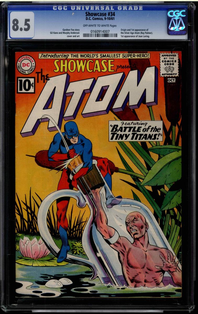 Showcase #34 CGC 8.5 off-white to white pages. Gardner Fox story, Gil Kane and Murphy Anderson cover and art. Origin and 1st appearance of the Silver Age Atom (Ray Palmer). 1st appearance of Jean Loring. Overstreet 2009 VF 8.0 value = $995; VF/NM 9.0 value = $1,898. The CGC universal census reports 4 at 8.5 and 12 higher.