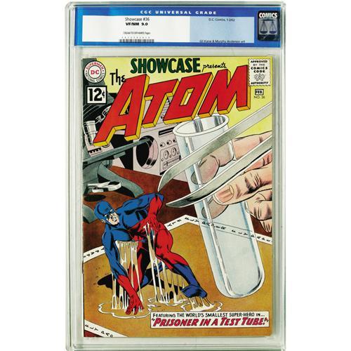 <B>Showcase #36 The Atom (DC, 1962) CGC VF/NM 9.0 Cream to off-white pages.</B></I> Heads up, Atom fans, this is just the third appearance of the Silver Age character. Gil Kane provided the cover and interior art. Overstreet 2006 VF/NM 9.0 value = $650; NM- 9.2 value = $900. CGC census 4/06: 4 in 9.0, 5 higher.
