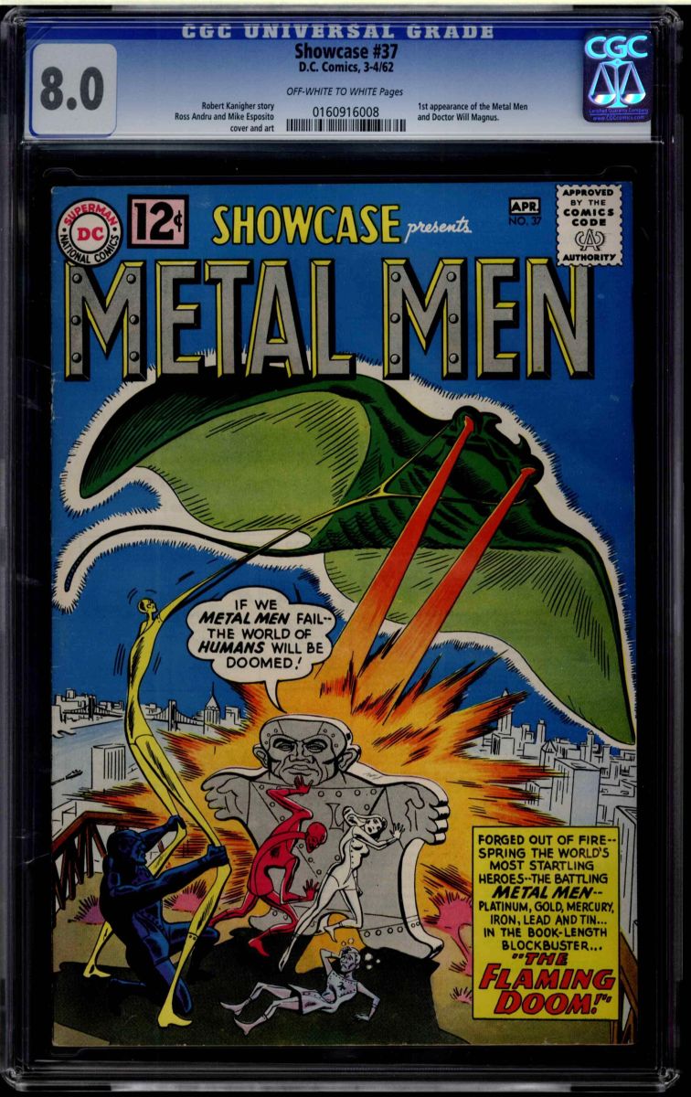 Showcase #37 CGC 8.0 off-white to white pages. Robert Kanigher story, Ross Andru and Mike Esposito cover and art. 1st appearance of the Metal Men and Doctor Will Magnus. Overstreet 2009 VF 8.0 value = $485. The CGC universal census reports 7 at 8.0 and 12 higher.