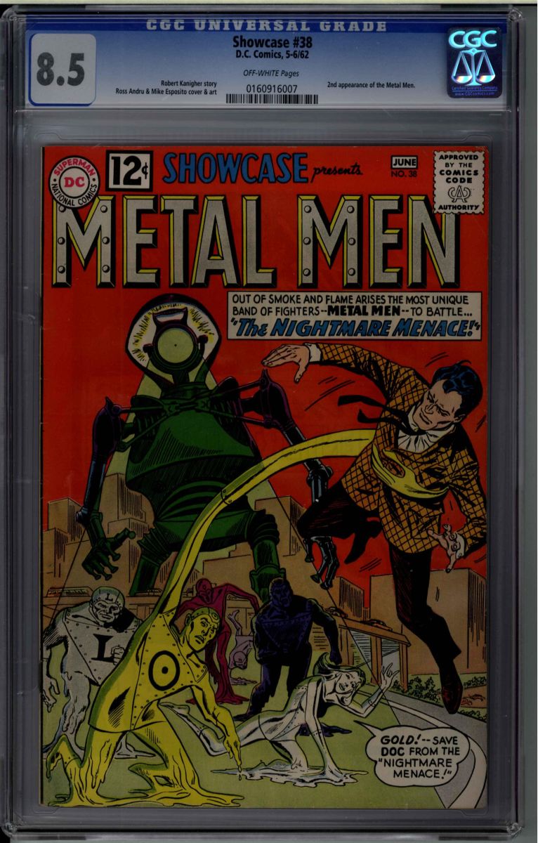 Showcase #38 CGC 8.5 off-white pages. Robert Kanigher story, Ross Andru & Mike Esposito cover and art. 2nd appearance of the Metal Men. Overstreet 2009 VF 8.0 value = $270; VF/NM 9.0 value = $498. CGC census: 5 at 8.5, 17 higher.