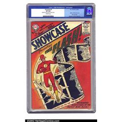 Showcase #4 (DC, 1956) CGC VF 8.0 Off-white pages. Julius Schwartz ushered in the Silver Age with this book, re-introducing the Flash to a new generation of readers. The Scarlet Speedster sported a new costume and a new identity, which would ultimately bring about the concept of two worlds of heroes in the DC universe. Flash would appear three more times before making the jump to his own series, a pattern that practically every other new DC hero would follow throughout the 1960s. Showcase #4 is quite scarce in high-grade; according to the CGC population report, this is the fourth-best existing copy. Light edge and spine wear are the only detractors on this otherwise bright, clean copy. Overstreet 2002 VF 8.0 value = $12,500. Important notice: We expect to be auctioning lots at the rate of 200-250 per hour. Sometimes eBay Premier live bid software cannot keep up with that pace, so we strongly recommend that you place a realistic proxy bid now as insurance to avoid disappointment. Also please note that all Heritage/CAA lots purchased through eBay Premier carry a 20% Buyer's Premium. Please make sure you read the Terms and Conditions.