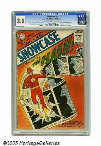 <B>Showcase #4 The Flash (DC, 1956) CGC GD/VG 3.0 Light tan to off-white pages.</B></I> This is one of the most significant comics of all time, as it's credited with returning superheroes to popularity and starting the Silver Age of comics! It's the first appearance of the Silver Age Flash, Barry Allen. The issue is the second most valuable Silver Age comic according to Overstreet. The cover and art are by penciler Carmine Infantino and inker Joe Kubert. Overstreet 2005 GD 2.0 value = $1,200; VG 4.0 value = $2,400. CGC census 6/05: 4 in 3.0, 51 higher. <I>From the collection of Joe and Nadia Mannarino.</B></I>