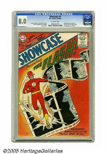 <B>Showcase #4 The Flash (DC, 1956) CGC VF 8.0 Off-white pages.</B></I> This is the first comic of the Silver Age according to many, and one of the most significant comic books ever published, no matter whom you ask! It's the first appearance of the Silver Age Flash, Barry Allen, published in the mid-1950s when the comic book industry was at a low point and there seemed to be next to no demand for existing superheroes, never mind new ones. But DC decided to bring one Golden Age hero back in revamped form for a tryout issue, with a new identity, costume, and origin. The experiment was a success, and Barry got his own title after a couple more <B>Showcase</B></I> appearances. The story, written by Bob Kanigher and drawn by Carmine Infantino and Joe Kubert, also featured the first appearance of Barry's girlfriend Iris West. It's the second most-valuable Silver Age comic according to Overstreet, and only a handful of copies have been graded higher, making this copy an attractive investment indeed. Overstreet 2005 VF 8.0 value = $13,200. CGC census 5/05: 6 in 8.0, 4 higher.