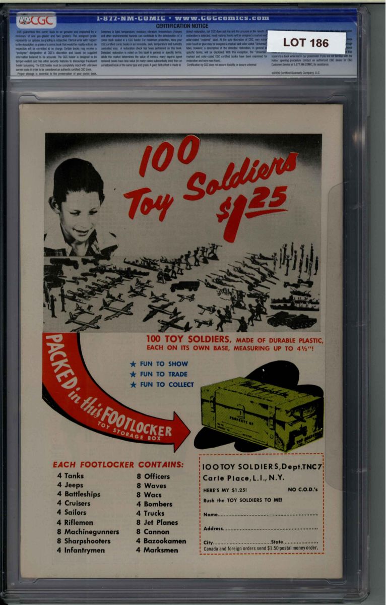 The Auctioneer has reserved the right to reject any and all bids, and to bid at the auction. Auctioneers Auctions are not on approval. Auctioneer does not allow certified material to be returned because of possible differences of opinion with respect to the grade offered by any third party organization, dealer, or service. Absolutely no guarantee of grade is offered for un-certified property sold and subsequently submitted to a third-party grading service. There will be no exceptions to this policy. Under extremely limited circumstances, (e.g. gross cataloging error) a purchaser, who did not bid from the floor, may request Auctioneer to evaluate voiding a sale; such request must be made in writing detailing the alleged gross error, and submission of the lot to the Auctioneer must be pre-approved by the Auctioneer. Bidder must notify Auctioneer in writing of such request within three (3) days of the non-floor bidder receipt of the lot. Any lot that is to be evaluated must be in our offices within 30 days after Auction. Grading does not qualify for this evaluation process nor do such complaints constitute a basis to challenge the authenticity of a lot. AFTER THAT 30-DAY PERIOD, NO LOTS MAY BE RETURNED FOR REASONS OTHER THAN AUTHENTICITY. Lots returned must be housed intact in the original holder. No lots purchased by floor Bidders may be returned (including those Bidders acting as agents for others). Late remittance for purchases may be considered just cause to revoke all return privileges. B: Auctions conducted solely on the Internet have a THREE (3) DAY RETURN POLICY: Lots paid for within seven days of the Auction closing are sold with a three (3) day return privilege. You may return lots under the following conditions: Within three days of receipt of the lot, you must first notify Auctioneer by contacting Client Service by phone (314-680-8599) or e-mail (moundcityauctions@gmail.com), and immediately mail the lot(s) fully insured to the attention of Returns, Mound City Auctions 1081 Teson Rd. Hazelwood, MO. 63042. Lots must be housed intact in their original holder and in their original condition. You are responsible for the insured, safe delivery of any lots. Auctioneer will not be responsible for lots returned in non-registered mail or lots returned without prior authorization per section B. A non-negotiable return fee of 5% of the purchase price ($10 per lot minimum) will be deducted from the refund for each returned lot or billed directly. Postage and handling fees are not refunded. After the three-day period (from receipt), no items may be returned for any reason. Late remittance for purchases revokes all Return-Restock privileges. C: Bidders who have inspected the lots prior to the auction will not be granted any return privileges. D: Comic books sold referencing a third-party grading service are sold “as is” without any express or implied warranty. Certain warranties may be available from the grading services and the Bidder is referred to them for further details: Certified Guaranty Company, LLC. (CGC), P.O. Box 4738, Sarasota, FL 34230. E: Bidders who intend to challenge authenticity or provenance of a lot must notify Auctioneer in writing within thirty (30) days of the Auctions conclusion. In the event Auctioneer cannot deliver the lot or subsequently it is established that the lot lacks title, provenance, authenticity, or other transfer or condition issue is claimed, Auctioneer's liability shall be limited to rescission of sale and refund of purchase price; in no case shall Auctioneer's maximum liability exceed the high bid on that lot, which bid shall be deemed for all purposes the value of the lot. After one year has elapsed, Auctioneer's maximum liability shall be limited to any commissions and fees Auctioneer earned on that lot. F: All comics are guaranteed genuine, but are not guaranteed as to grade, since grading is a matter of opinion, an art and not a science, and therefore the opinion rendered by the Auctioneer or any third party grading service may not agree with the opinion of others (including trained experts), and the same expert may not grade the same item with the same grade at two different times. G: Since we cannot examine encapsulated comics, they are sold “as is”without our grading opinion, and may not be returned for any reason. Auctioneer shall not be liable for any patent or latent defect or controversy pertaining to or arising from any encapsulated collectible. In any such instance, purchaser's remedy, if any, shall be solely against the service certifying the collectible. H: Due to changing grading standards over time, differing interpretations, and to possible mishandling of items by subsequent owners, Auctioneer reserves the right to grade items differently than shown on certificates from any grading service that accompany the items. Auctioneer also reserves the right to grade items differently than the grades shown in the prior catalog should such items be reconsigned to any future auction. I: Although consensus grading is employed by most grading services, it should be noted as aforesaid that grading is not an exact science. In fact, it is entirely possible that if a lot is broken out of a plastic holder and resubmitted to another grading service or even to the same service, the lot could come back with a different grade assigned. J: Certification does not guarantee protection against the normal risks associated with potentially volatile markets. The degree of liquidity for certified collectibles will vary according to general market conditions and the particular lot involved. For some lots there may be no active market at all at certain points in time."