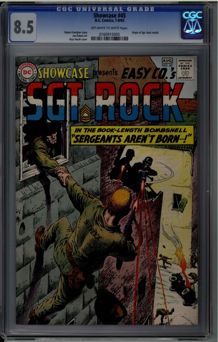 Showcase #45 CGC 8.5 off-white to white pages. Robert Kanigher story, Joe Kubert art, Russ Heath cover. Origin of Sgt Rock retold. Overstreet 2009 VF 8.0 value = $239; VF/NM 9.0 value = $445. CGC census: 7 at 8.5, 9 higher.
