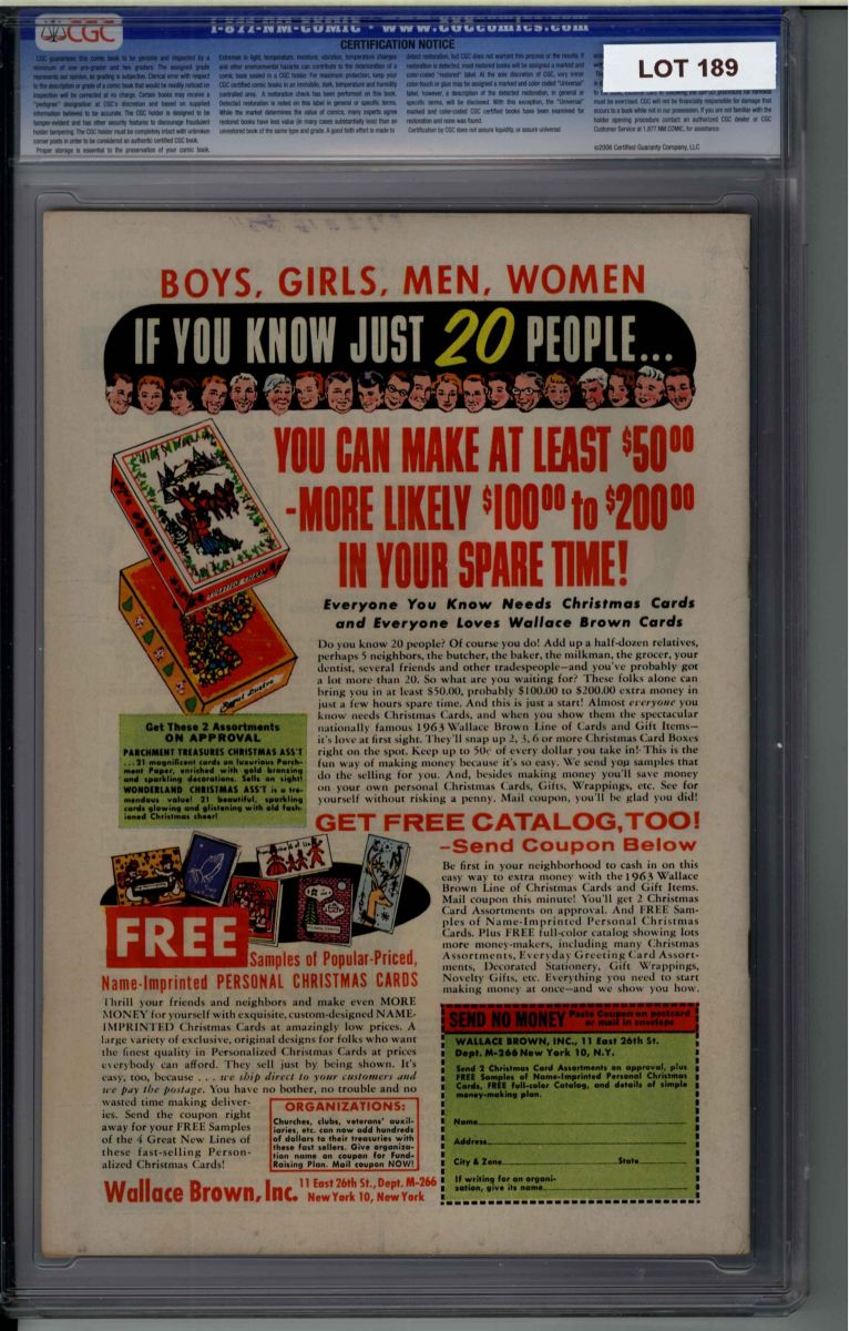 The Auctioneer has reserved the right to reject any and all bids, and to bid at the auction. Auctioneers Auctions are not on approval. Auctioneer does not allow certified material to be returned because of possible differences of opinion with respect to the grade offered by any third party organization, dealer, or service. Absolutely no guarantee of grade is offered for un-certified property sold and subsequently submitted to a third-party grading service. There will be no exceptions to this policy. Under extremely limited circumstances, (e.g. gross cataloging error) a purchaser, who did not bid from the floor, may request Auctioneer to evaluate voiding a sale; such request must be made in writing detailing the alleged gross error, and submission of the lot to the Auctioneer must be pre-approved by the Auctioneer. Bidder must notify Auctioneer in writing of such request within three (3) days of the non-floor bidder receipt of the lot. Any lot that is to be evaluated must be in our offices within 30 days after Auction. Grading does not qualify for this evaluation process nor do such complaints constitute a basis to challenge the authenticity of a lot. AFTER THAT 30-DAY PERIOD, NO LOTS MAY BE RETURNED FOR REASONS OTHER THAN AUTHENTICITY. Lots returned must be housed intact in the original holder. No lots purchased by floor Bidders may be returned (including those Bidders acting as agents for others). Late remittance for purchases may be considered just cause to revoke all return privileges. B: Auctions conducted solely on the Internet have a THREE (3) DAY RETURN POLICY: Lots paid for within seven days of the Auction closing are sold with a three (3) day return privilege. You may return lots under the following conditions: Within three days of receipt of the lot, you must first notify Auctioneer by contacting Client Service by phone (314-680-8599) or e-mail (moundcityauctions@gmail.com), and immediately mail the lot(s) fully insured to the attention of Returns, Mound City Auctions 1081 Teson Rd. Hazelwood, MO. 63042. Lots must be housed intact in their original holder and in their original condition. You are responsible for the insured, safe delivery of any lots. Auctioneer will not be responsible for lots returned in non-registered mail or lots returned without prior authorization per section B. A non-negotiable return fee of 5% of the purchase price ($10 per lot minimum) will be deducted from the refund for each returned lot or billed directly. Postage and handling fees are not refunded. After the three-day period (from receipt), no items may be returned for any reason. Late remittance for purchases revokes all Return-Restock privileges. C: Bidders who have inspected the lots prior to the auction will not be granted any return privileges. D: Comic books sold referencing a third-party grading service are sold “as is” without any express or implied warranty. Certain warranties may be available from the grading services and the Bidder is referred to them for further details: Certified Guaranty Company, LLC. (CGC), P.O. Box 4738, Sarasota, FL 34230. E: Bidders who intend to challenge authenticity or provenance of a lot must notify Auctioneer in writing within thirty (30) days of the Auctions conclusion. In the event Auctioneer cannot deliver the lot or subsequently it is established that the lot lacks title, provenance, authenticity, or other transfer or condition issue is claimed, Auctioneer's liability shall be limited to rescission of sale and refund of purchase price; in no case shall Auctioneer's maximum liability exceed the high bid on that lot, which bid shall be deemed for all purposes the value of the lot. After one year has elapsed, Auctioneer's maximum liability shall be limited to any commissions and fees Auctioneer earned on that lot. F: All comics are guaranteed genuine, but are not guaranteed as to grade, since grading is a matter of opinion, an art and not a science, and therefore the opinion rendered by the Auctioneer or any third party grading service may not agree with the opinion of others (including trained experts), and the same expert may not grade the same item with the same grade at two different times. G: Since we cannot examine encapsulated comics, they are sold “as is”without our grading opinion, and may not be returned for any reason. Auctioneer shall not be liable for any patent or latent defect or controversy pertaining to or arising from any encapsulated collectible. In any such instance, purchaser's remedy, if any, shall be solely against the service certifying the collectible. H: Due to changing grading standards over time, differing interpretations, and to possible mishandling of items by subsequent owners, Auctioneer reserves the right to grade items differently than shown on certificates from any grading service that accompany the items. Auctioneer also reserves the right to grade items differently than the grades shown in the prior catalog should such items be reconsigned to any future auction. I: Although consensus grading is employed by most grading services, it should be noted as aforesaid that grading is not an exact science. In fact, it is entirely possible that if a lot is broken out of a plastic holder and resubmitted to another grading service or even to the same service, the lot could come back with a different grade assigned. J: Certification does not guarantee protection against the normal risks associated with potentially volatile markets. The degree of liquidity for certified collectibles will vary according to general market conditions and the particular lot involved. For some lots there may be no active market at all at certain points in time."