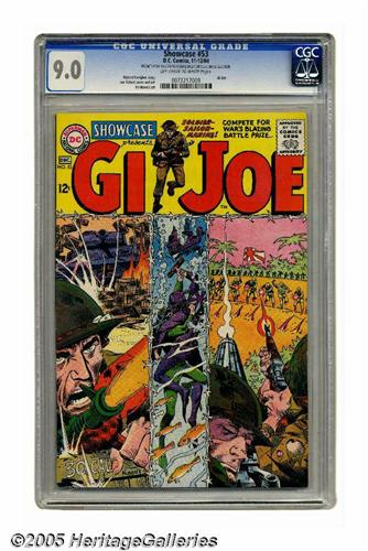 <B>Showcase #53 GI Joe (DC, 1964) CGC VF/NM 9.0 Off-white to white pages.</B></I> Joe Kubert cover. Irv Novick art. CGC notes, "From the Dallas Stephens collection." Overstreet 2005 VF/NM 9.0 value = $131; NM- 9.2 value = $175. CGC census 7/05: 3 in 9.0, 6 higher.