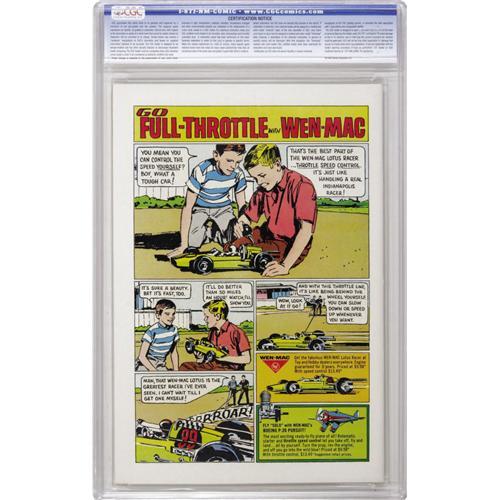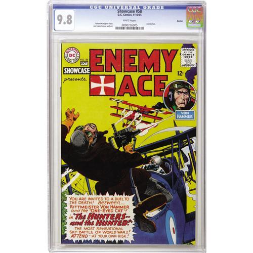 <B>Showcase #58 Enemy Ace - Boston pedigree (DC, 1965) CGC NM/MT 9.8 White pages.</B></I> How about this for an unusual concept: World War I from the viewpoint of a German pilot. This is the fifth appearance of the Enemy Ace, Rittmeister von Hammer, drawn with great style by Joe Kubert. This copy is extremely glossy and clean. Instruct your sniveling orderly to put in a bid! Overstreet 2006 NM- 9.2 value = $290. CGC census 10/06: 2 in 9.8, none higher.<BR><BR><b>Shipping:</b> Slabbed Comic (<a target="_blank" href="http://www.heritageauctions.com/common/shipping.php">view shipping information</a>)