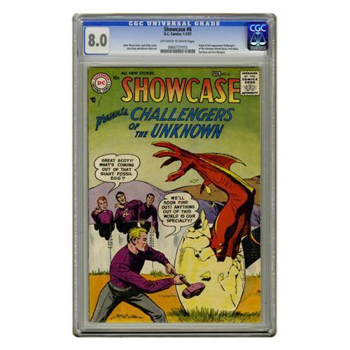<B>Showcase #6 Challengers of the Unknown (DC, 1957) CGC VF 8.0 Off-white to white pages.</B></I> It's the first appearance of the Challengers of the Unknown, as well as their origin. What should four strangers do if they miraculously survive a plane crash? Form a team of adventurers, of course! Not only was this the first Silver Age hero team, it was the first original concept for a Silver Age series. The cover and interior art are by Jack Kirby. It seems that no top-grade copies of this book have come to light -- only one copy (a 9.0) has been certified with a higher grade than this one to date. Overstreet 2005 VF 8.0 value = $2,503. CGC census 12/05: 2 in 8.0, 1 higher.