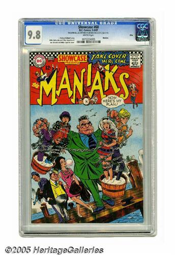 <B>Showcase #68 Maniaks - Ohio pedigree (DC, 1967) CGC NM/MT 9.8 White pages.</B></I> We're pleased to offer the best known copy of this <B>Showcase</B></I> issue, the first appearance of the Maniaks. The Monkees-like group was drawn by Joe Orlando on the cover and Mike Sekowsky inside the book. CGC notes, "From the Dallas Stephens collection." Overstreet 2005 NM- 9.2 value = $55. CGC census 7/05: 1 in 9.8, none higher.
