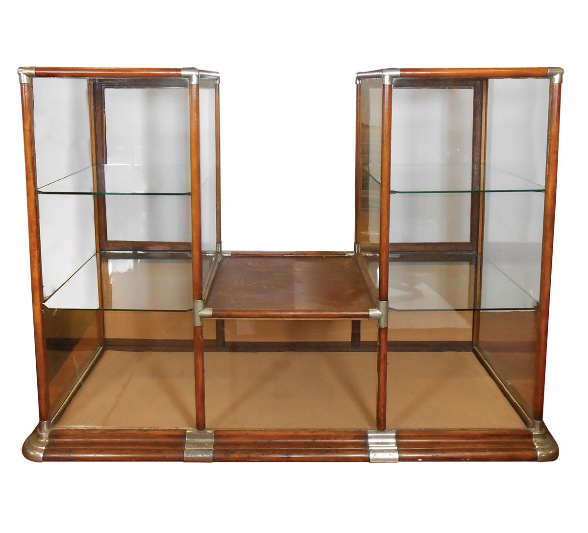 Showcase, double tower, cherry w/German silver trim, "L. Paulle Maker-241 & 243 2nd Ave S, Minneapolis, MN" stamped in 2 center pcs of trim, wood panel on top of center section for cash register, VG/Exc cond, 43"H x 60"W x 26"D.