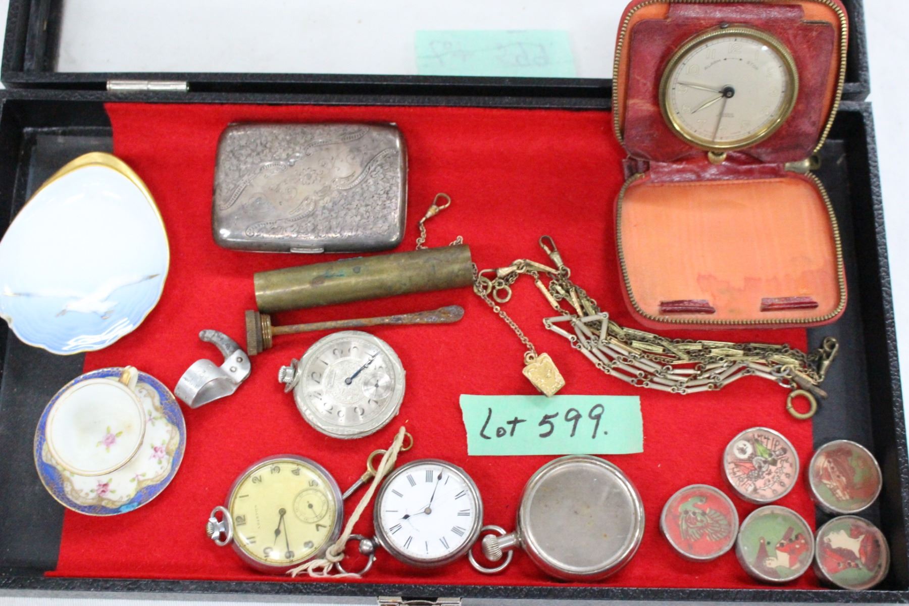 Showcase of Pocket Watches, a Snuff Spoon, Travel Clock, Watch Chains, String Cutter, Games, etc. (*