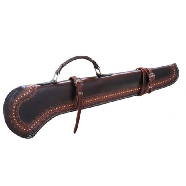 Showman ® 34" Barbed wire tooled gun scabbard with copper buckles.  This gun scabbard features smooth dark leather accented with a barbed wire tooled border and copper studded trim and features a rolled leather handle for easy carry. Measures 34" long.