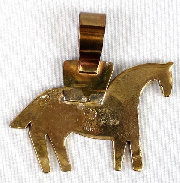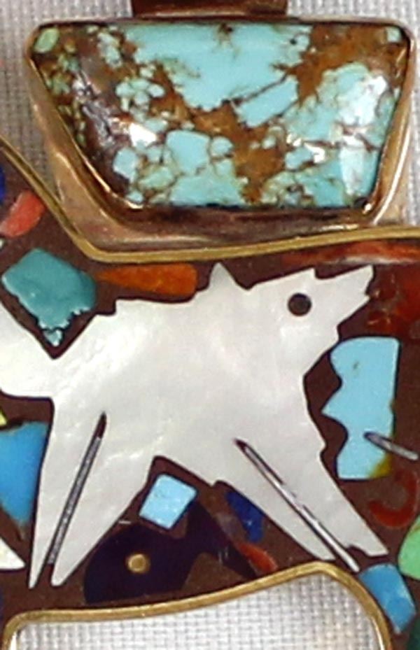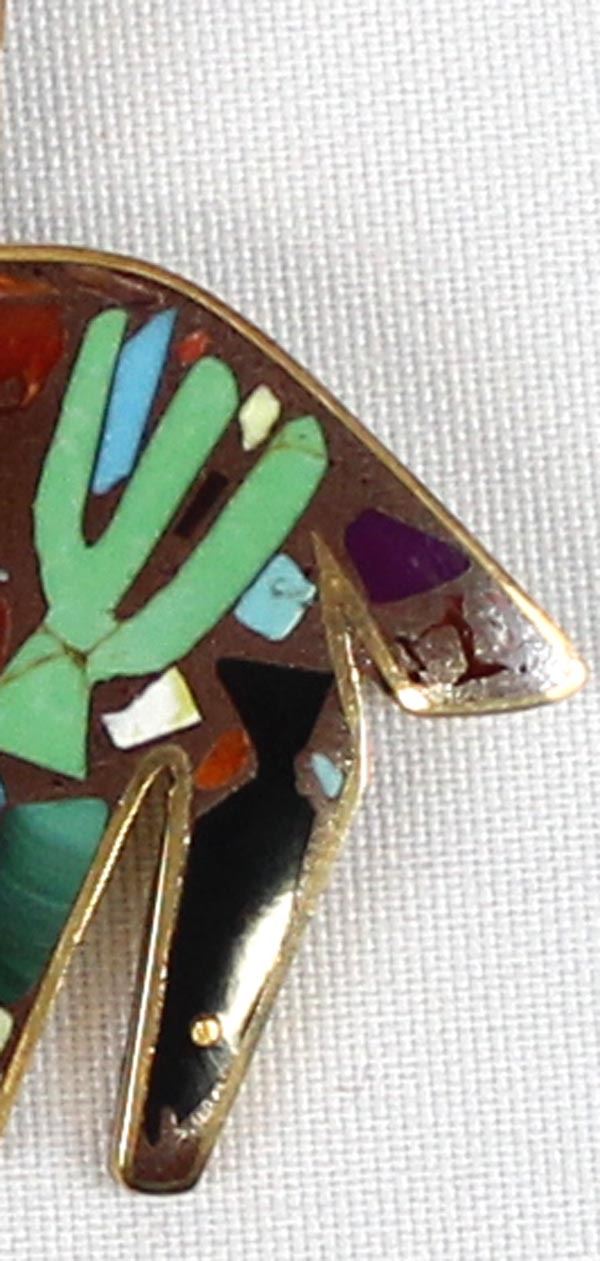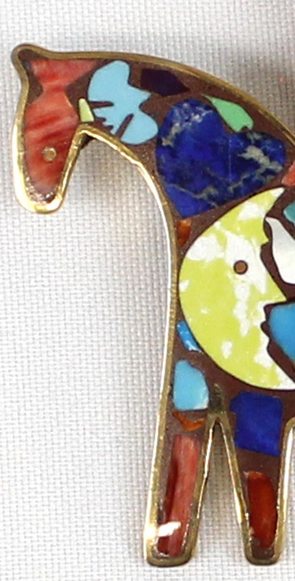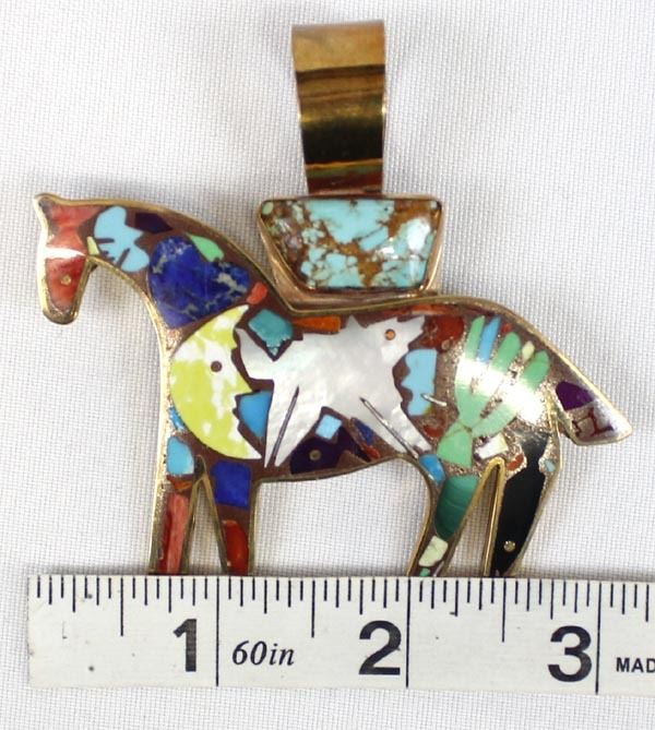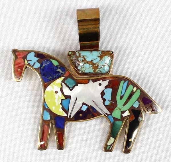 Southwestern Shows Studios Copper Inlay Horse Pendant by Turza Wells & Andrew Shows, measures 2.5'' x 3'' and is hallmarked, inlay includes turquoise, red shell, lapis, gaspiete, mother of pearl, sugilite, and jet