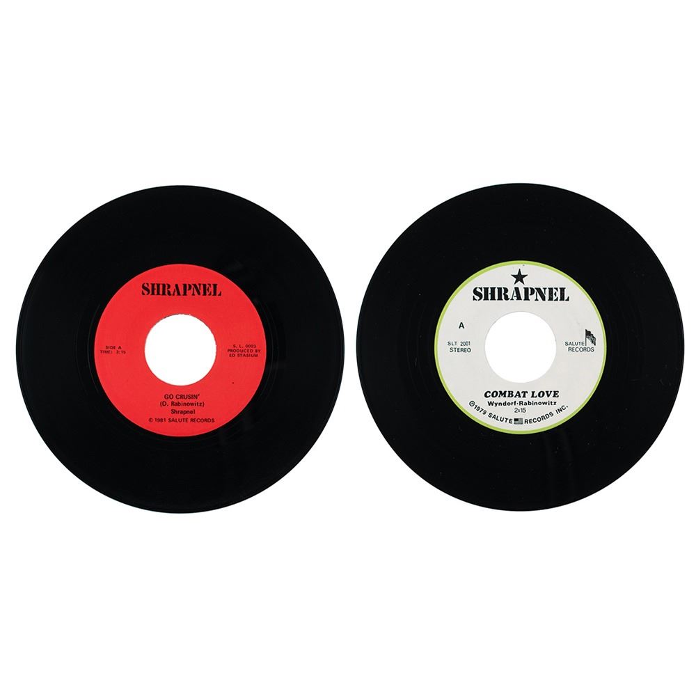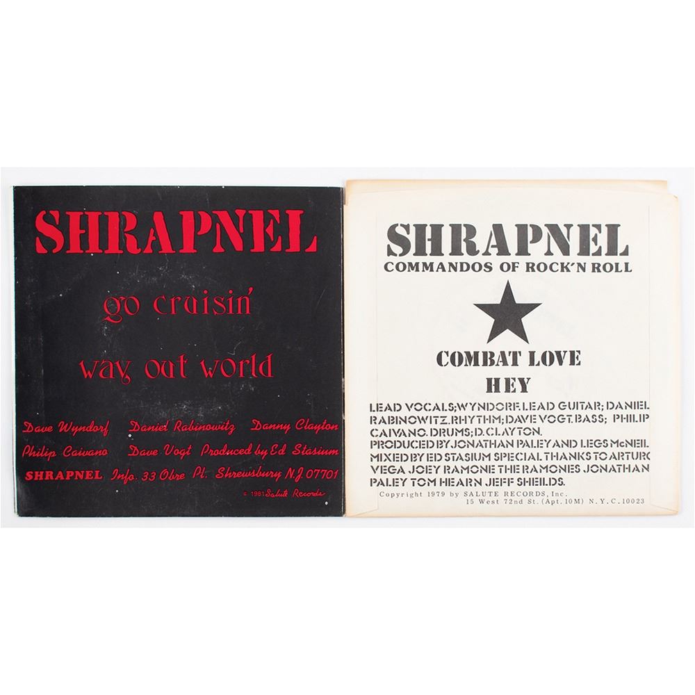 Early pairing of Salute Records 45 RPM records for the Shrapnel singles ‘Combat Love / Hey’ and ‘Go Cruisin’ / Way Out World.’ The records are included. In overall fine condition. Accompanied by a 45 RPM record for the Wayne County and the Backstreet Boys single ‘Max's Kansas City.’ The single ‘Combat Love’ features background vocals by Joey Ramone.