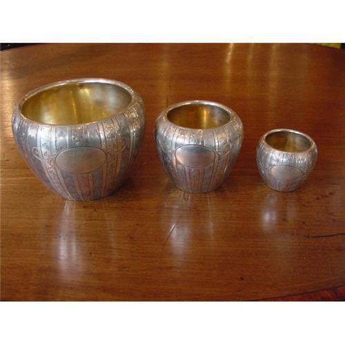 Finely crafted set of engraved sterling vases by Shreve & Co. These vases feature an empty cartouche within beautifully detailed engraving. The largest vase measures 3 1/4" tall with a 3 3/4" wide top, the medium vase is 2 1/2" tall with a 2 3/4" wide top, and the smallest vase is 1 5/8" tall with a 1 7/8" wide top. The base is marked with an S on each side of the bell (rarely used after 1918). Additionally, the vases are marked "Shreve & Co. Sterling San Francisco". Very good condition. Circa 1915.