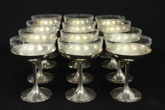 Sterling Silver. Glass is etched. Stamped Shreve Sterling San Francisco. Bases leaded. Monogrammed "K". 1 liner chipped dowel.